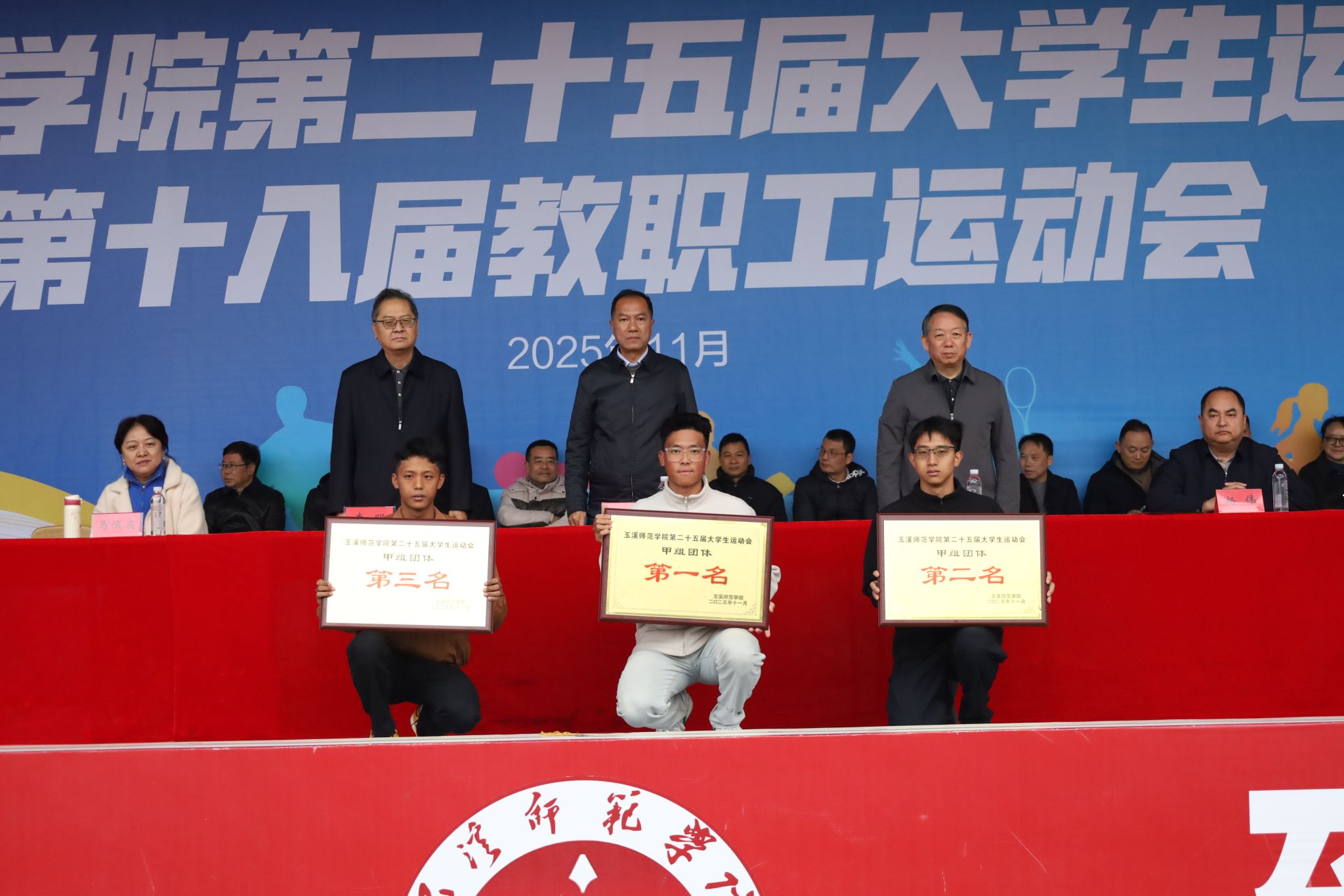 11月21日下午,玉溪师范学院第二十五届大学生运动会暨第十八届教职工运动会闭幕式在田径场举行。学校党政领导,各职能部门、学院负责人参加闭幕式。闭幕式由校党委委员、副校长、体育运动委员会主任李涛主持。
