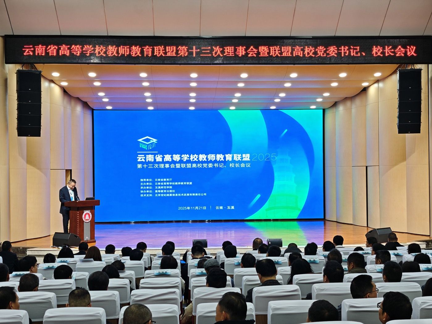 11月21日,云南省高等学校教师教育联盟2025年第十三次理事会暨联盟高校党委书记、校长会议在玉溪师范学院举行。联盟成员单位代表齐聚玉溪,围绕“数智驱动·育人革新构建教师教育高质量发展新范式”主题展开讨论,共同探讨数字时代边疆教师教育的新形态和新模式。