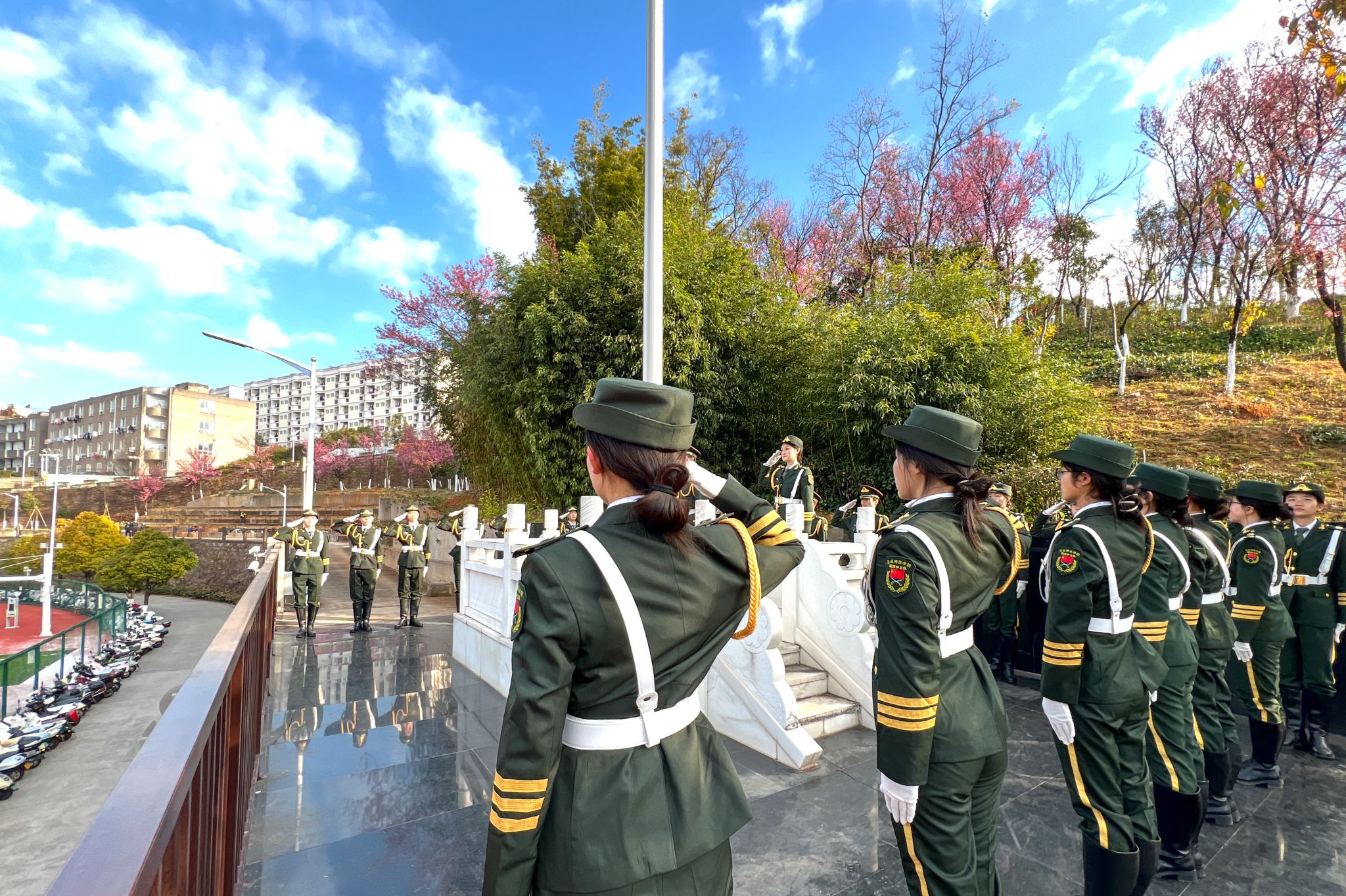 活动在庄严的升国旗仪式中拉开帷幕。玉溪师范学院国旗护卫队迈着整齐的步伐入场,全体人员肃立注目,齐唱国歌,展现了浓厚的爱国情怀与集体荣誉感。