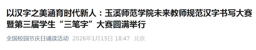 日前,玉溪师范学院未来教师规范汉字书写大赛暨第三届学生“三笔字”大赛举行。活动由国家语言文字推广基地(玉溪师范学院)主办,以“规范书写、传承文化、铸魂育人”为主题,吸引了全校1400余名学生踊跃参与,其中包括60余名来华留学生和10余名学校首届研究生,赛事规模与影响力持续提升。