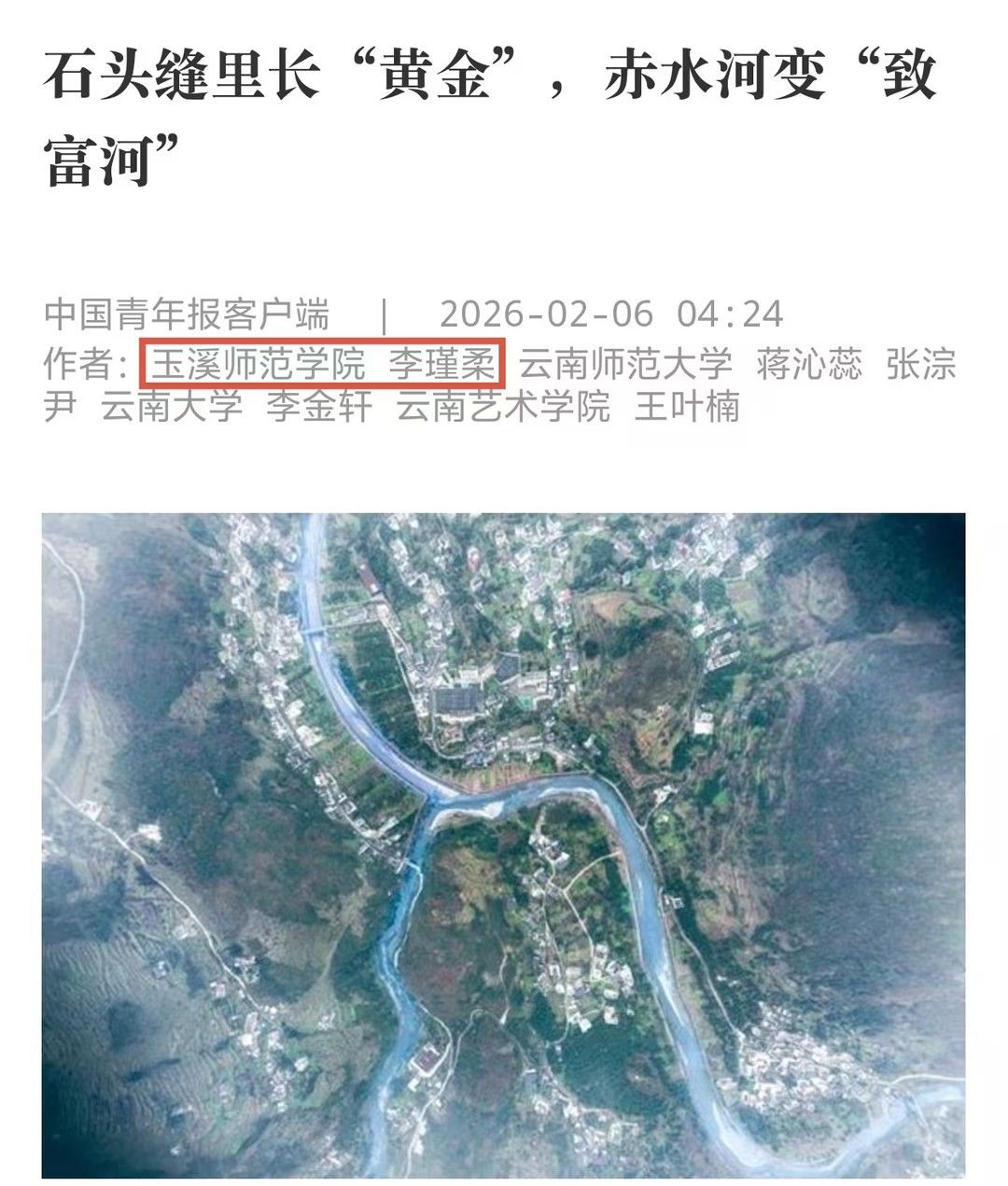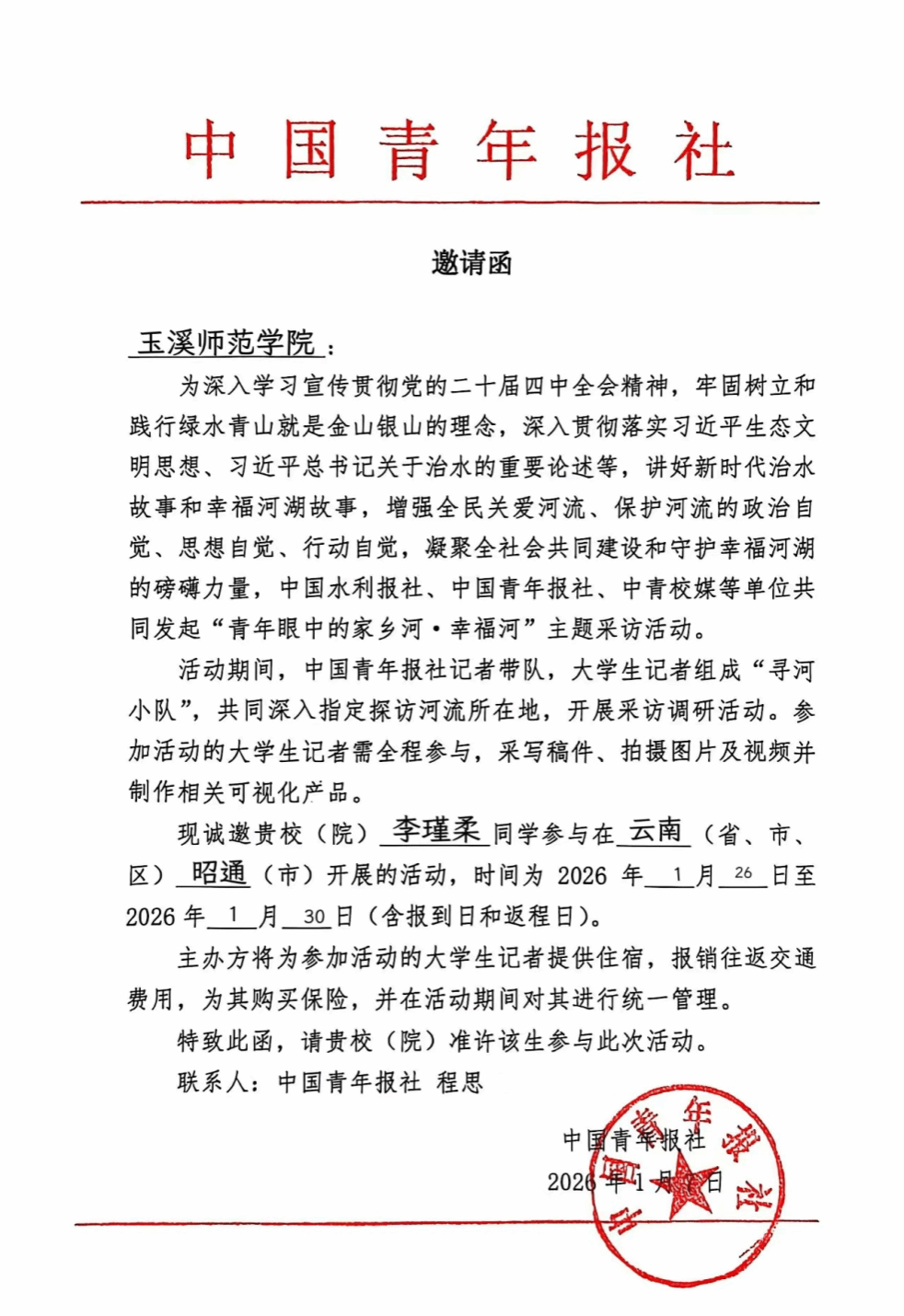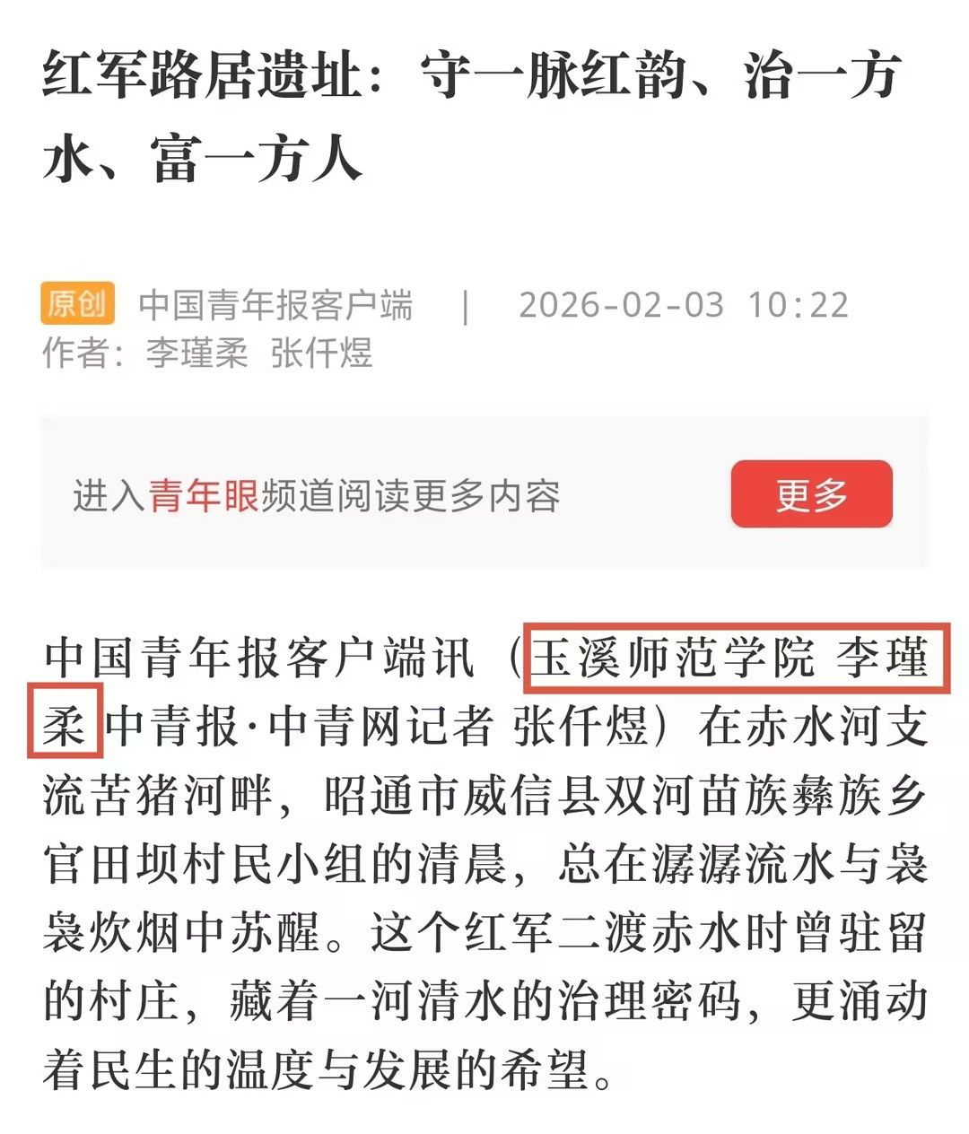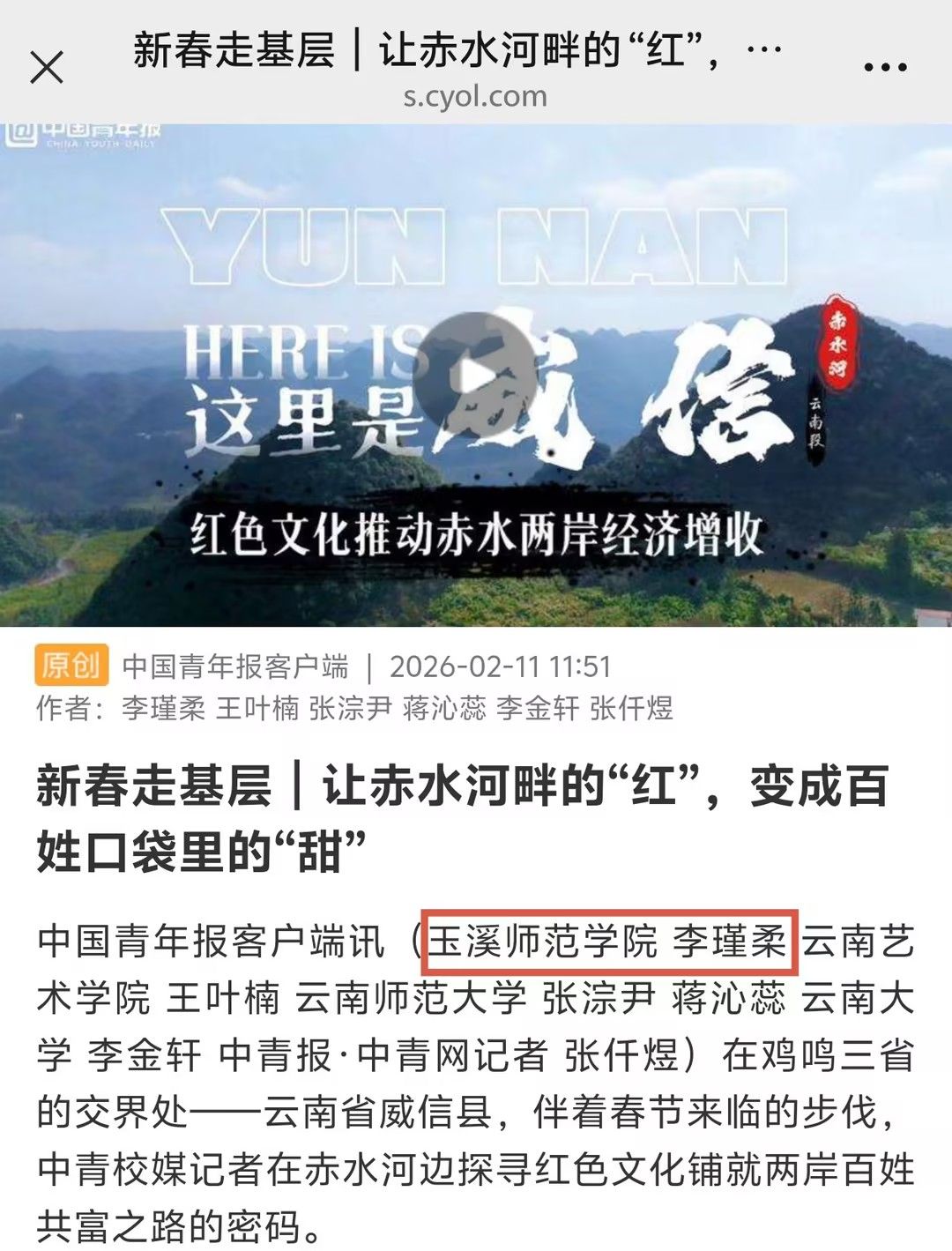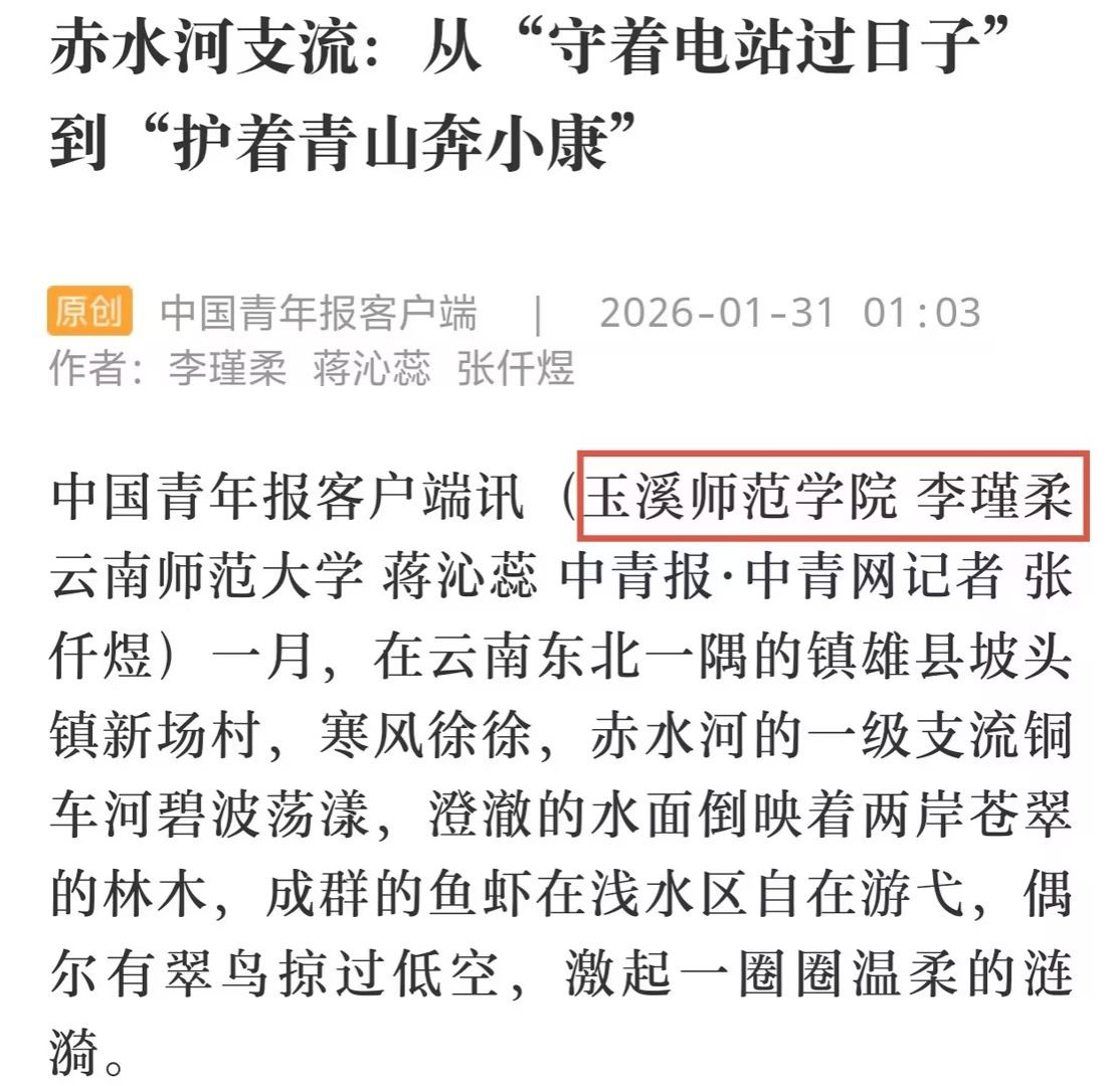 近日,由水利部指导,中国水利报社、中国青年报社联合主办,中青校媒承办的“青年眼中的家乡河·幸福河”第二季活动圆满结束。玉溪师范学院新闻学专业2023级学生李瑾柔成功入选中青校媒云南昭通寻河小队,赴镇雄、威信两县沿赤水河开展实地采访与报道撰写。