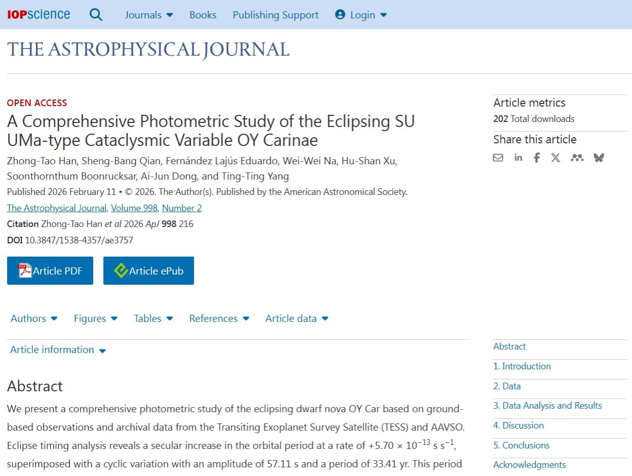 论文(1)由韩忠涛博士担任第一作者及通讯作者,合作作者包括团队成员徐虎山博士、那维炜博士,以及云南大学、贵州师范大学、泰国国家天文研究所、阿根廷拉普拉塔国立大学等国内外科研单位研究人员。该研究基于食变矮新星 OY Carinae 长达46年的综合观测数据,整合地面望远镜观测、TESS 卫星巡天及美国变星观测者协会(AAVSO)长期监测资料,对该双星系统轨道变化开展精确分析。