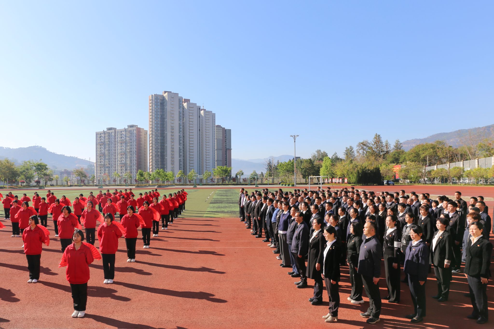 23日上午,调研组与其他单位在丽江华坪女子高级中学共同参加党性教育活动,学习感悟张桂梅精神。全体人员在女高操场上整齐列队,齐声诵读《中国共产党章程》, 面向党旗重温入党誓词,朗诵毛泽东诗词《七律·长征》,歌唱《没有共产党就没有新中国》《唱支山歌给党听》,观摩女高师生红色课间操,与女高师生同唱红色歌曲、共诵红色诗篇。大家纷纷表示,此次党性教育,思想深受洗礼、方向更加明确,将以张桂梅老师为标杆,把对党忠诚、为民服务的初心融入行动,以饱满热情投身本职工作。马克思主义学院院长时遂营教授接受华坪县融媒体中心采访,表示“回去之后,我们一定会将华坪女高感悟到的精神传递给更多学生,助力教育强国。”