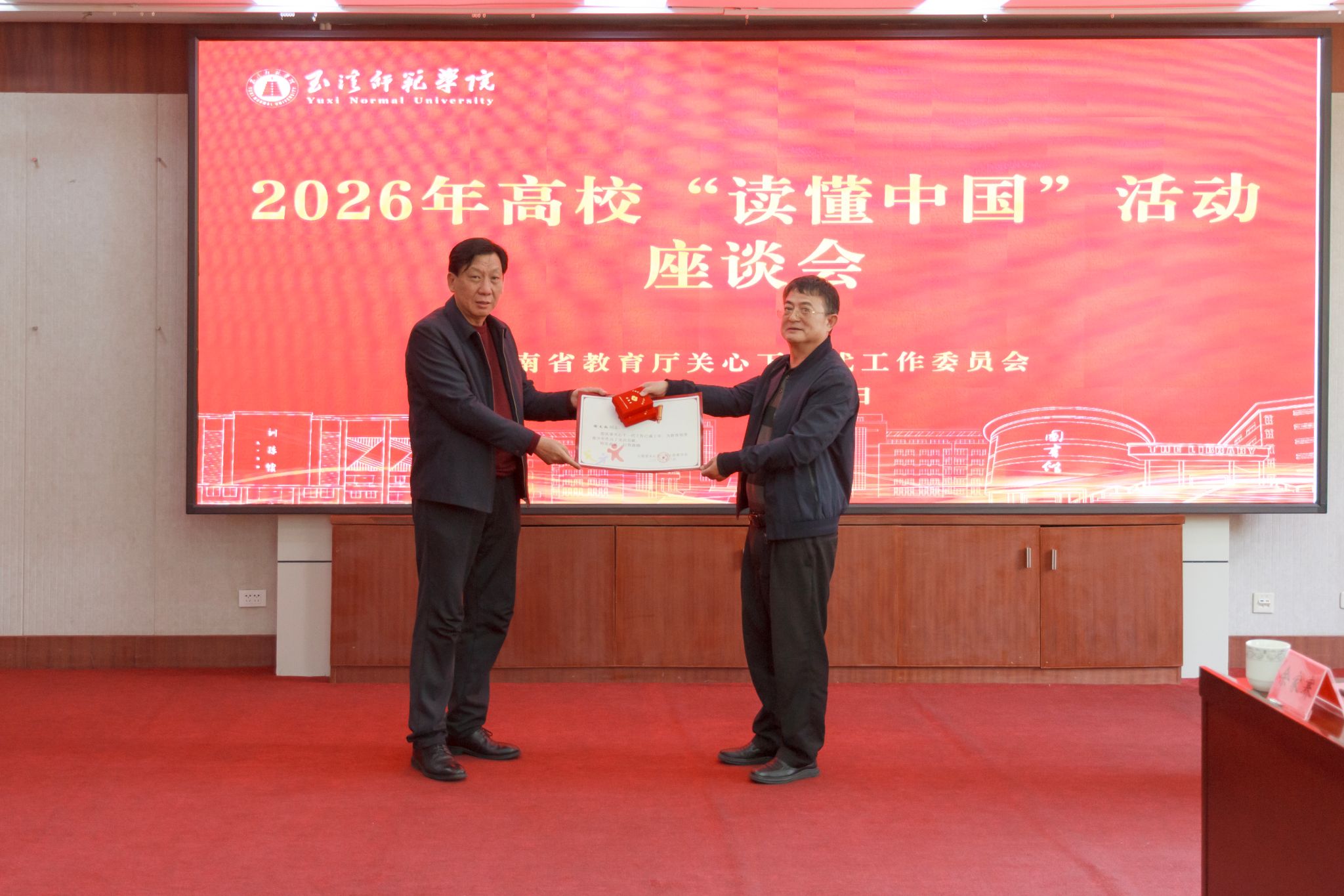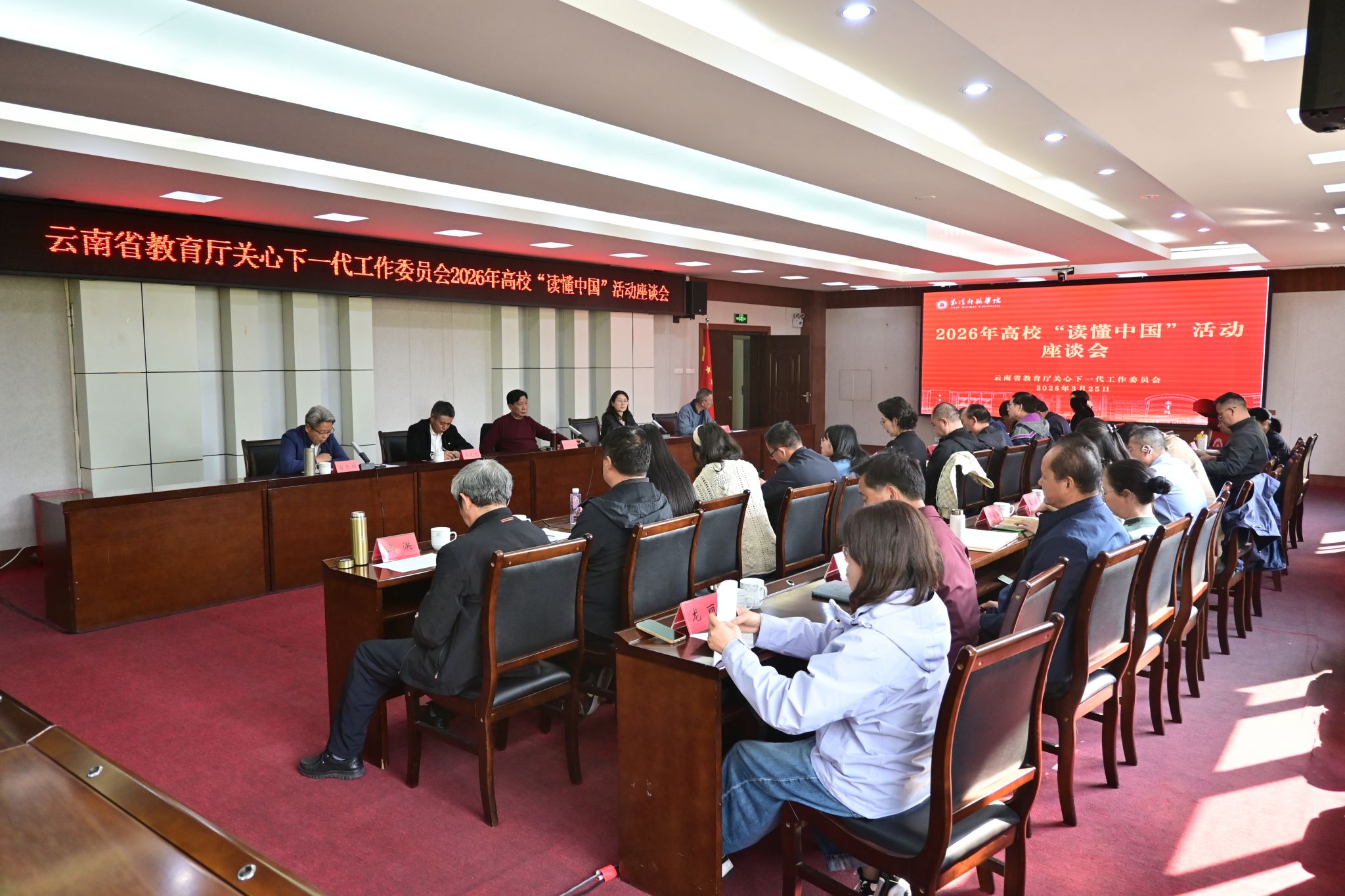 3月25日,云南省教育厅关工委在玉溪师范学院召开滇南地区高校“读懂中国”活动座谈会。省教育厅关工委常务副主任刘沧山、副主任孙云宾、副秘书长吕志雄出席并讲话。红河学院、文山学院、普洱学院、玉溪农业职业技术学院、玉溪职业技术学院、云南锡业职业技术学院、红河卫生职业学院、红河职业技术学院、文山职业技术学院、西双版纳职业技术学院、云南三鑫职业技术学院11所滇南地区高校关工委负责同志及玉溪师范学院校院两级关工委负责同志共30余人参加会议。会议由吕志雄主持。