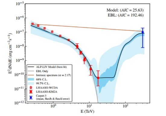 图1:运用ALP-LIV协同机制解释了GRB 221009A 的LHAASO 及 Carpet-3的多波段甚高能辐射