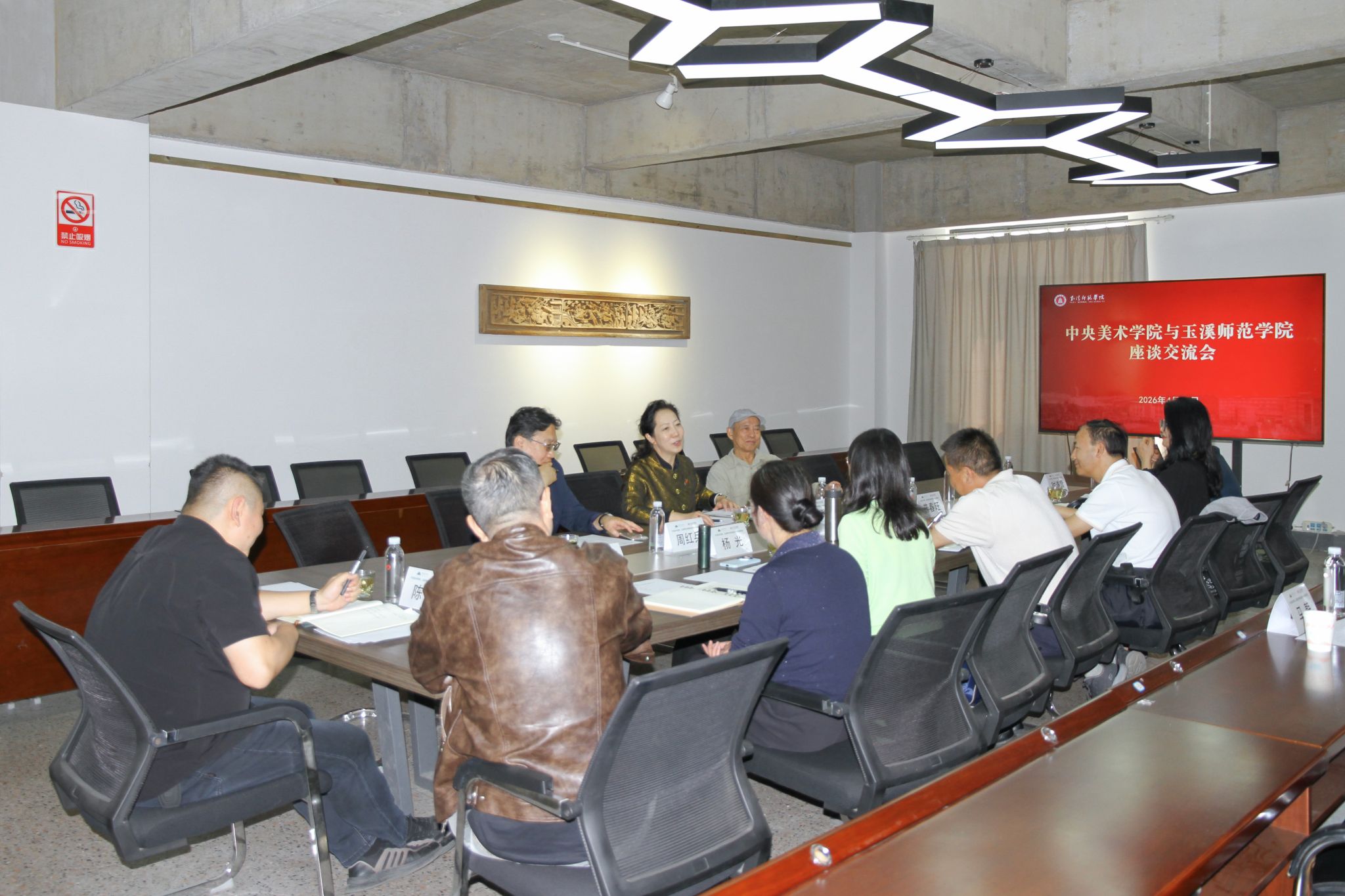 4月16日,中央美术学院与玉溪师范学院座谈交流会在玉溪师范学院美术学院举行。中央美术学院党委副书记王晓琳,关工委副主任周红兵,孙景波教授、胡明哲教授;玉溪师范学院党委副书记、校长段红云,党委副书记杨光,相关部门负责人及美术学院党政领导、专业负责人等参加座谈。座谈会由杨光主持。