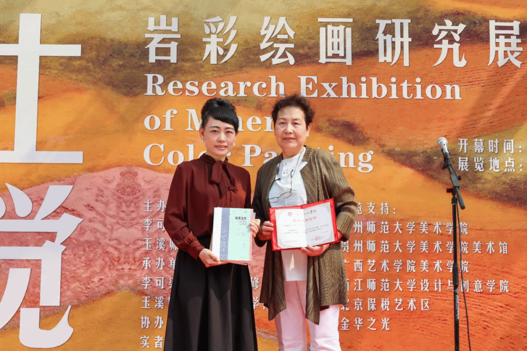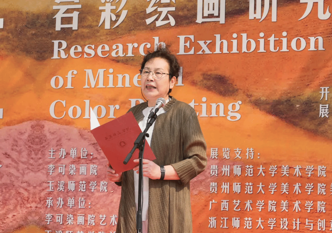 本次展览策展人、中央美术学院胡明哲教授在致辞中详细解读了岩彩艺术的内涵。她介绍,当代中国岩彩绘画已发展三十余年,近十年来岩彩艺术家走出画室,深入大地采集本土材质,重新发现本土地质与本土文明的深层关联,实现了“在地性创作”的自我觉醒。胡明哲指出,此次展出的作品均来自李可染画院“岩彩绘画课程体系”第三次实施的师生作品,是对自然物质审美样态与精神内涵的深入探寻,真实记录着中国本土绘画由传统向现代转型的历史轨迹。她特别提到,本次展出的两件作品,正是2012年她来到云南首次进行本土采集后,运用原生态有色砂岩和有色土创作而成,这种实验性探索赋予了岩彩绘画独特的学术价值与发展活力。
