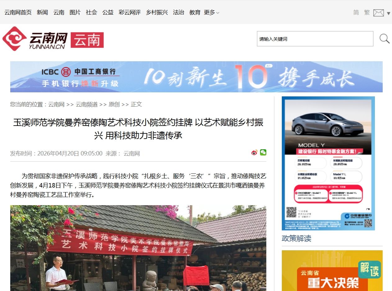 为贯彻国家非遗保护传承战略,践行科技小院“扎根乡土、服务‘三农’”宗旨,推动傣陶技艺创新发展,4月18日下午,玉溪师范学院曼养窑傣陶艺术科技小院签约挂牌仪式在景洪市嘎洒镇曼养村曼养窑陶瓷工艺品工作室举行。