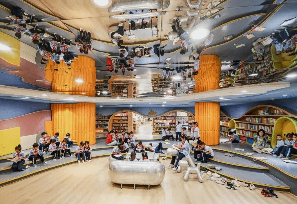 2025年5月29日,孩子们在山东荣成新世纪城市书房阅读。