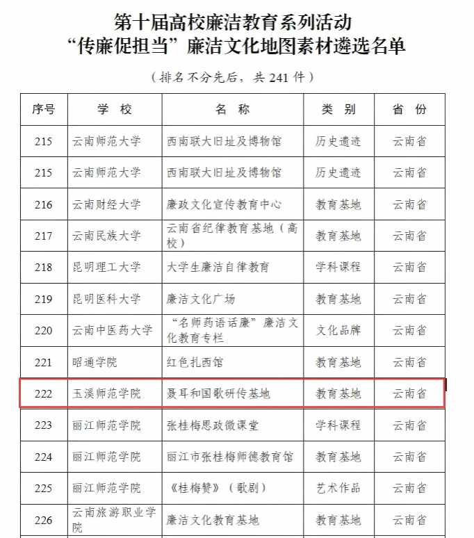 近日,教育部办公厅公布第十届高校廉洁教育系列活动结果,玉溪师范学院“聂耳和国歌研传基地”凭借深厚的红色文化底蕴和鲜明的廉洁教育特色,成功入选“传廉促担当”廉洁文化地图素材(教育基地类别)遴选名单,为云南省入选的十二件素材之一。这是我校持续讲好“聂耳和国歌的故事”取得的又一标志性成果,也是学校在新时代廉洁文化建设进程中获得国家级平台认可。