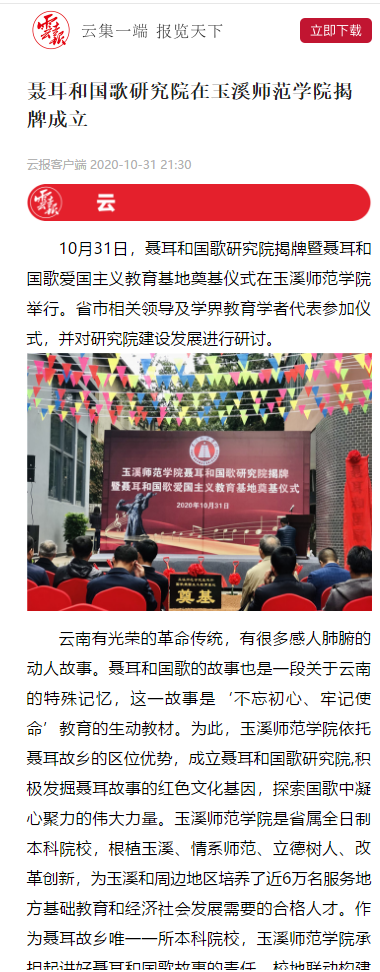 10月31日,聂耳和国歌研究院揭牌暨聂耳和国歌爱国主义教育基地奠基仪式在玉溪师范学院举行。省市相关领导及学界教育学者代表参加仪式,并对研究院建设发展进行研讨。
