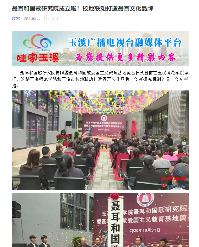 聂耳和国歌研究院揭牌暨聂耳和国歌爱国主义教育基地奠基仪式日前在玉溪师范学院举行。这是玉溪师范学院和玉溪市校地联动打造聂耳文化品牌、创新研究机制的又一创新举措。
