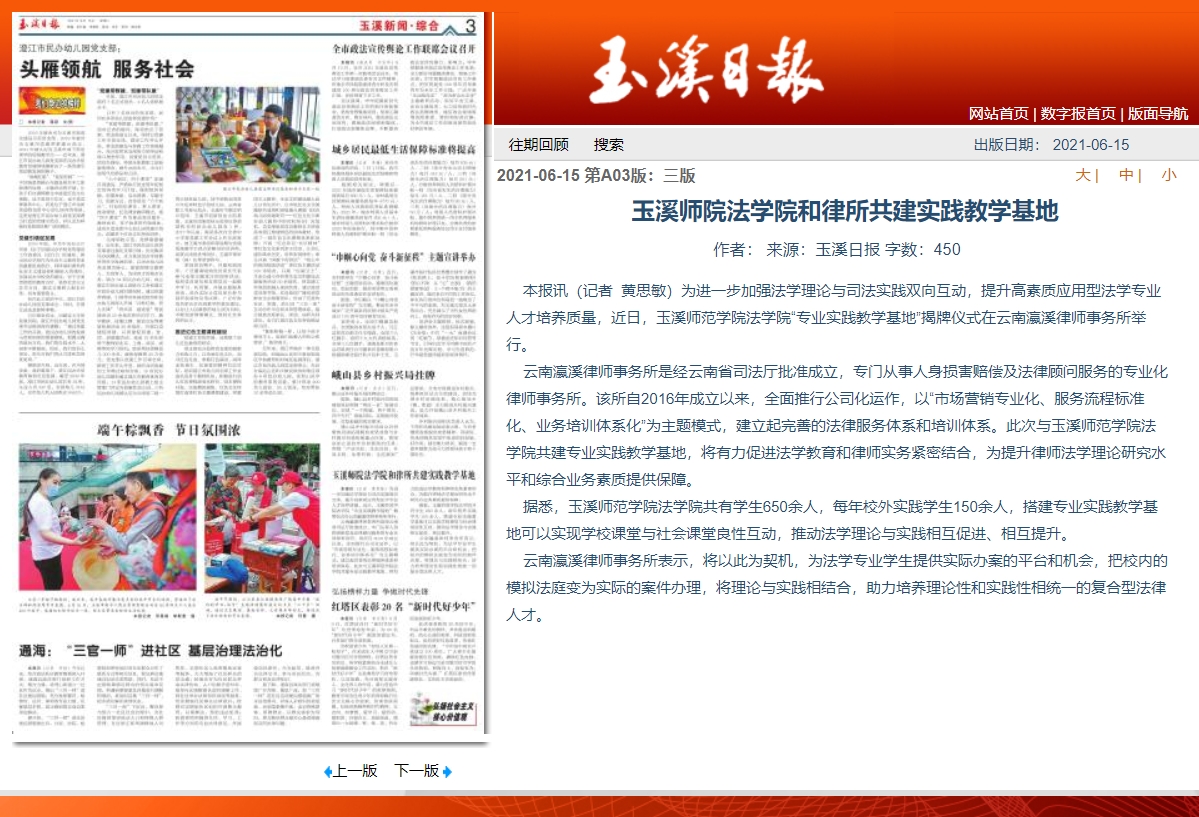 据悉,玉溪师范学院法学院共有学生650余人,每年校外实践学生150余人,搭建专业实践教学基地可以实现学校课堂与社会课堂良性互动,推动法学理论与实践相互促进、相互提升。