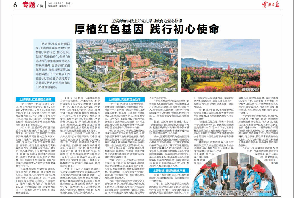党史学习教育开展以来,玉溪师范学院早谋划、早部署,积极行动,精心组织,做实“规定动作”,创新“自选动作”,紧扣落实立德树人的根本任务,围绕学校“加强基层党建、加快转型发展、加速内涵提升”三大重点工作任务,扎实推进学校党史学习教育,把党史学习教育这门必修课讲精彩。