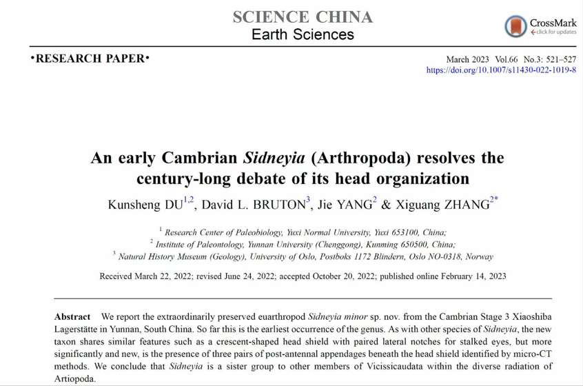 作为加拿大布尔吉斯生物群的明星化石之一,西德尼虫的头部触角后附肢是否存在,一直是悬而未决的科学问题。日前,云南玉溪师范学院杜坤省博士联合云南大学、挪威奥斯陆大学在西德尼虫属头部结构研究中取得新进展,研究认为西德尼虫具有3对触角后附肢,确认西德尼虫属与其他的异尾虫类构成姊妹群,归属物种分异的类肢动物。这对研究真节肢动物的演化历史和谱系分析具有重要意义。相关研究成果在《中国科学:地球科学》杂志中英文同时在线发表。