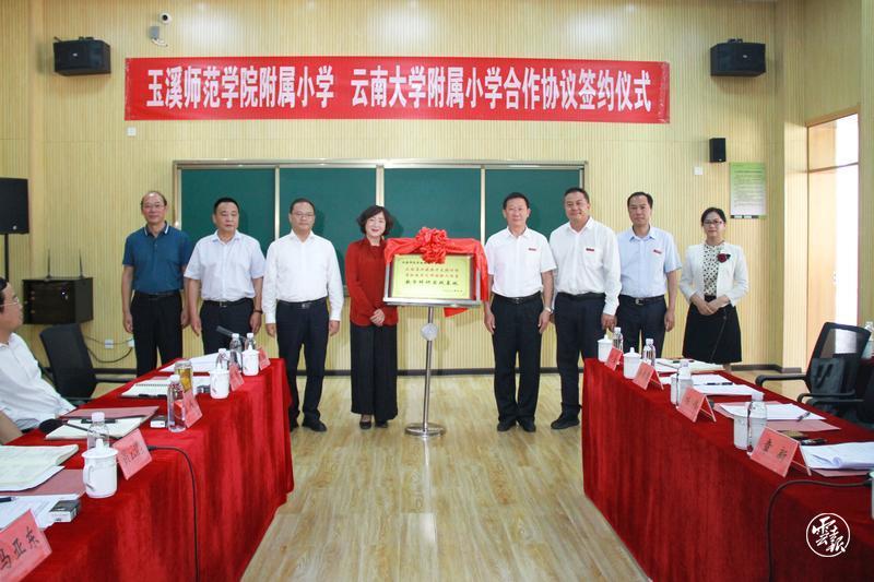签约仪式上,玉溪师范学院附属小学校长杨琼英与云南大学附属小学校长谢静共同签订合作协议,玉溪师院附小“云南省兴滇英才支持计划省级教学名师谢静工作室教学科研实践基地”挂牌。