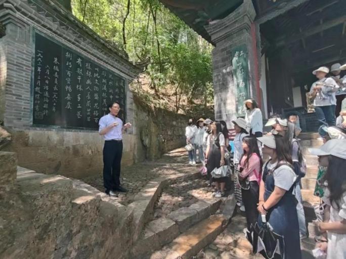 通海县为国家历史文化名城,西南地区的礼乐名邦,儒风昌盛。基地师生在玉溪市作家协会相关负责同志带领下,在通海文庙和秀山开展了沉浸式语言文字体验。在文庙,同学们通过交互式讲解,对儒家倡导的礼乐文化、教育思想、民本主张等进行深入学习,特别了解了通海当地儒学家、语言学家葛中选的音律研究和诗歌创作。在秀山的“匾山楹海”中,基地师生在专家引导下,从书法、音律、字趣、意趣等方面鉴赏楹联,并现场开展朗诵活动。现场学习结束后,基地师生开展了语言文字教学研讨,大家积极讨论如何将本土传统文化资源转化为教学资源,融入国家通用语言文字推广及教学中。