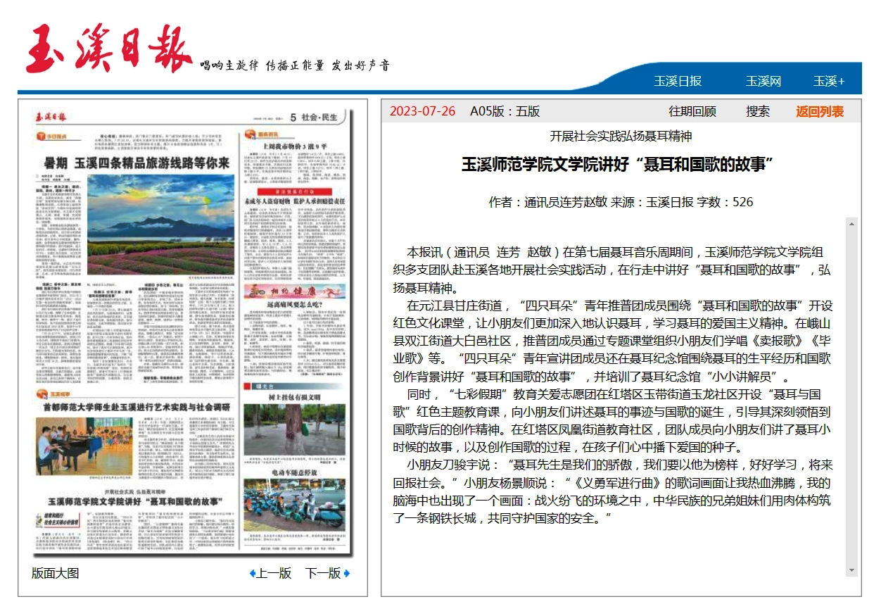 本报讯(通讯员 连芳 赵敏)在第七届聂耳音乐周期间,玉溪师范学院文学院组织多支团队赴玉溪各地开展社会实践活动,在行走中讲好“聂耳和国歌的故事”,弘扬聂耳精神。