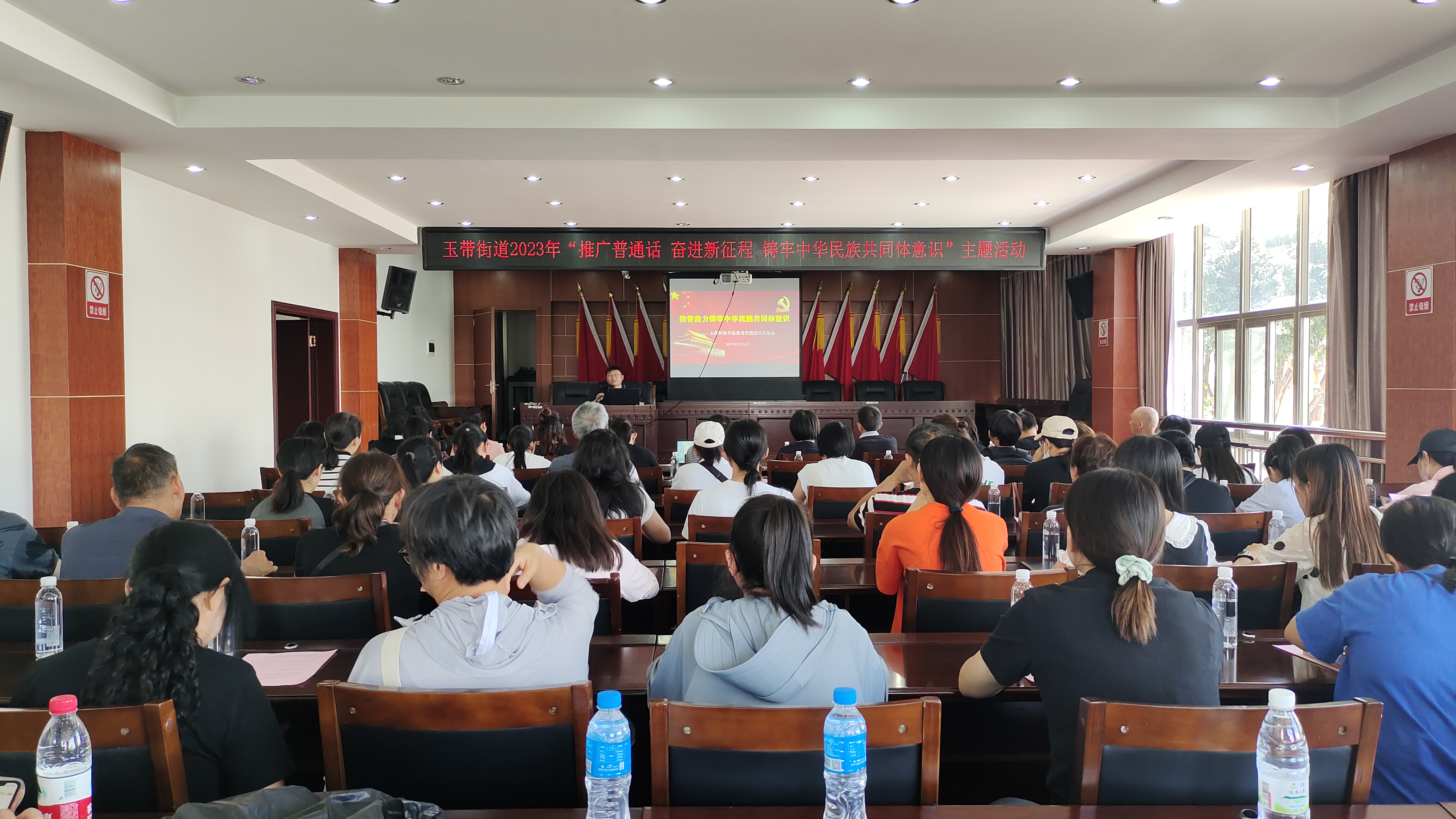 为深入学习宣传贯彻党的二十大精神和习近平总书记关于语言文化的重要指示批示精神,以铸牢中华民族共同体意识为主线,加大国家通用语言文字推广力度,传承弘扬中华优秀语言文化,营造学习使用国家通用语言文字的浓厚氛围,9月15日,玉带街道开展“推广普通话 奋进新征程 铸牢中华民族共同体意识”主题宣讲活动。街道、社区、少数民族代表等65人参加活动。玉带街道党工委宣传委员贾黎鹏、玉溪师范学院宣传部副部长戴志、玉溪师范学院宣传部舆论宣传科科长张晶晶、玉溪师范学院新闻中心校报编辑部主任廖鹏飞参加活动。