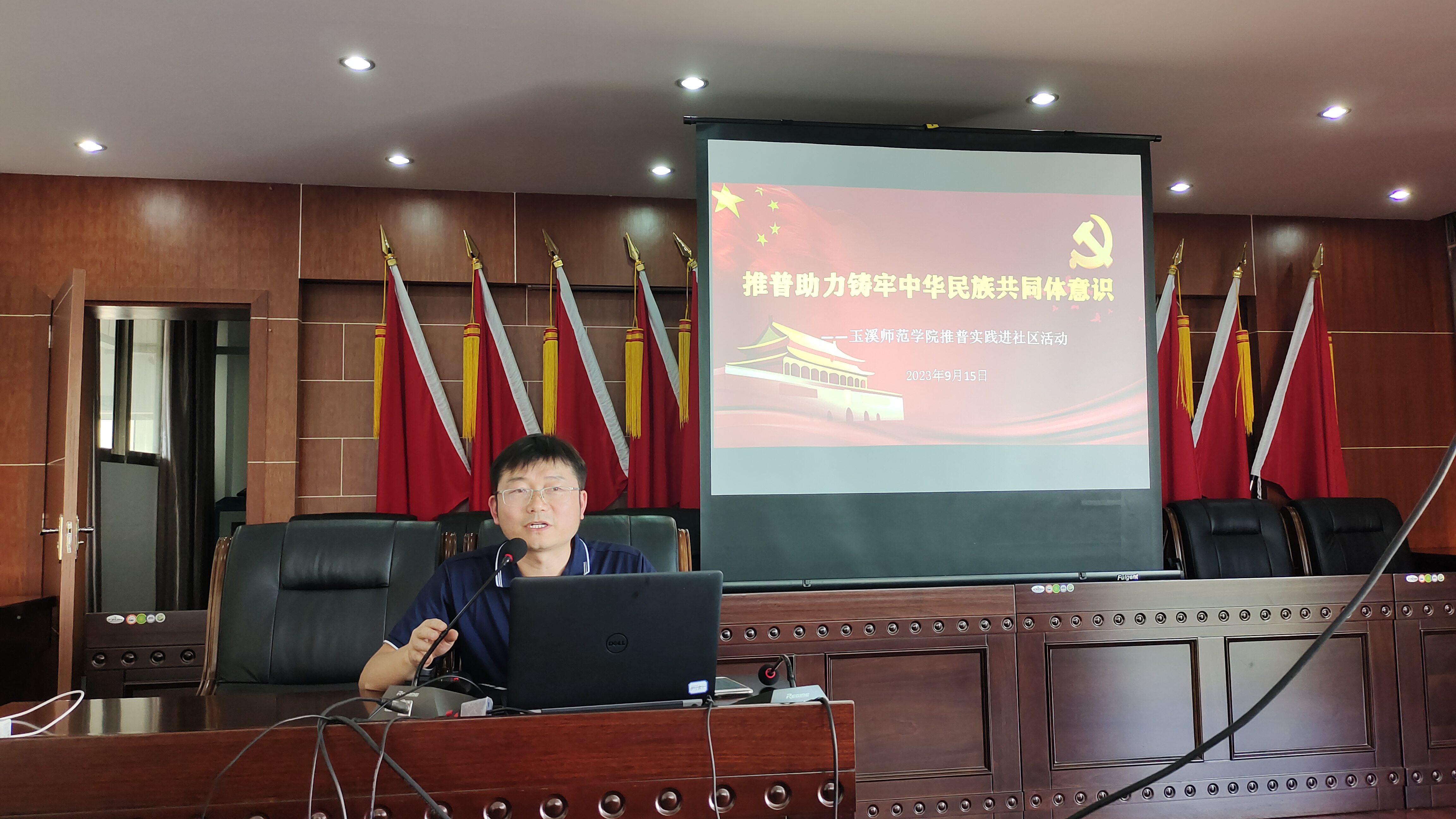 活动中,邀请玉溪师范学院新闻中心校报编辑部主任廖鹏飞老师到玉带街道作专题宣讲。廖老师以《推普助力中华民族共同体意识》为题,围绕中华民族共同体意识的时代背景、应对挑战、铸牢目的、认同根本、认同核心、认同渊源、顶层构设、文化载体、具体举措等方面进行宣讲。