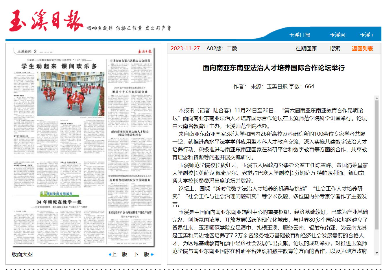 本报讯(记者 陆合春)11月24日至26日,“第六届南亚东南亚教育合作昆明论坛”面向南亚东南亚法治人才培养国际合作论坛在玉溪师范学院科学讲堂举行。论坛由云南省教育厅主办,玉溪师范学院承办。