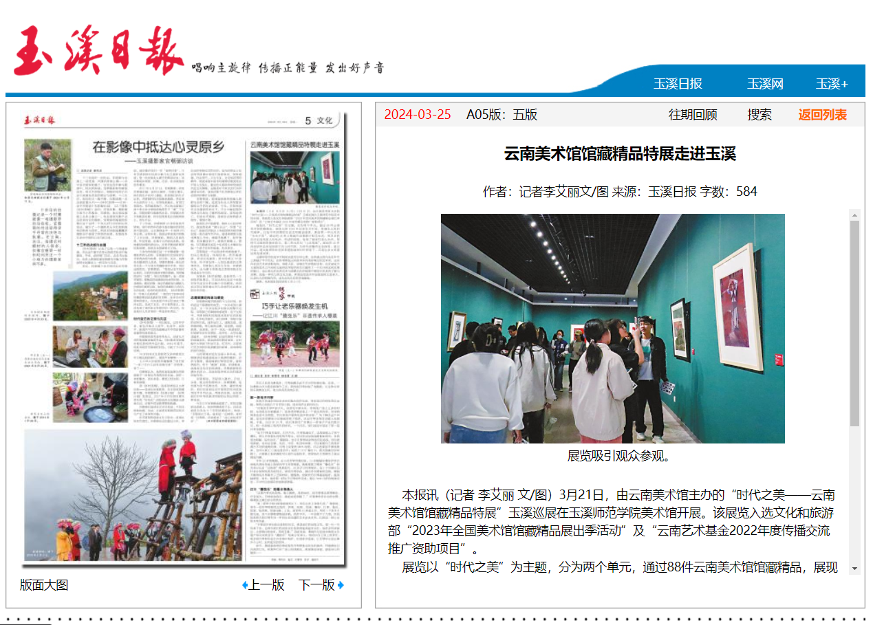 本报讯(记者 李艾丽 文/图)3月21日,由云南美术馆主办的“时代之美——云南美术馆馆藏精品特展”玉溪巡展在玉溪师范学院美术馆开展。该展览入选文化和旅游部“2023年全国美术馆馆藏精品展出季活动”及“云南艺术基金2022年度传播交流推广资助项目”。