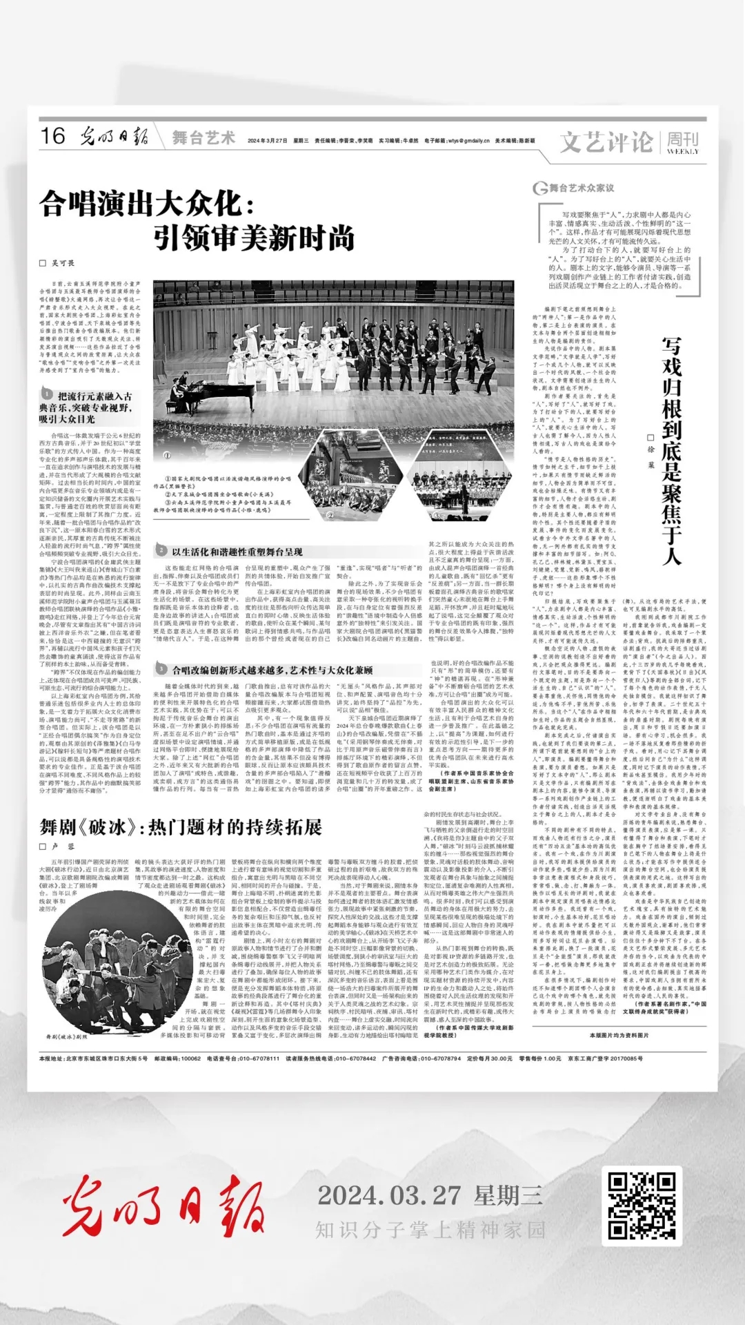 其中,有一个现象值得反思:不少合唱团在演唱有流量的热门歌曲时,基本是通过齐唱的方式简单移植原版,或是在低规格的多声部演绎中降低了作品的含金量,其结果不但没有博得眼球,反而让原本应该颇具技术含量的多声部合唱陷入了“滑稽戏”的囹圄之中。要知道,即便如上海彩虹室内合唱团的诸多“无厘头”风格作品,其声部对位、和声配置、演唱音色均十分讲究,始终坚持了“品控”为先,可以说“品相”极佳。天下泉城合唱团近期演绎了2024年总台春晚爆款歌曲《上春山》的合唱改编版,凭借在“不插电”(采用钢琴伴奏或无伴奏,对比于用原声音乐磁带伴奏而言)排练厅环境下的精彩演绎,不但得到了歌曲原作者的留言点赞,还在短视频平台收获了上百万的浏览量和几十万的转发量,成了合唱“出圈”的开年重磅之作。这也说明,好的合唱改编作品不能只有“形”的简单模仿,还要有“神”的精湛再现。在“形神兼备”中不断磨砺合唱团的艺术水准,方可让合唱“出圈”成为可能。