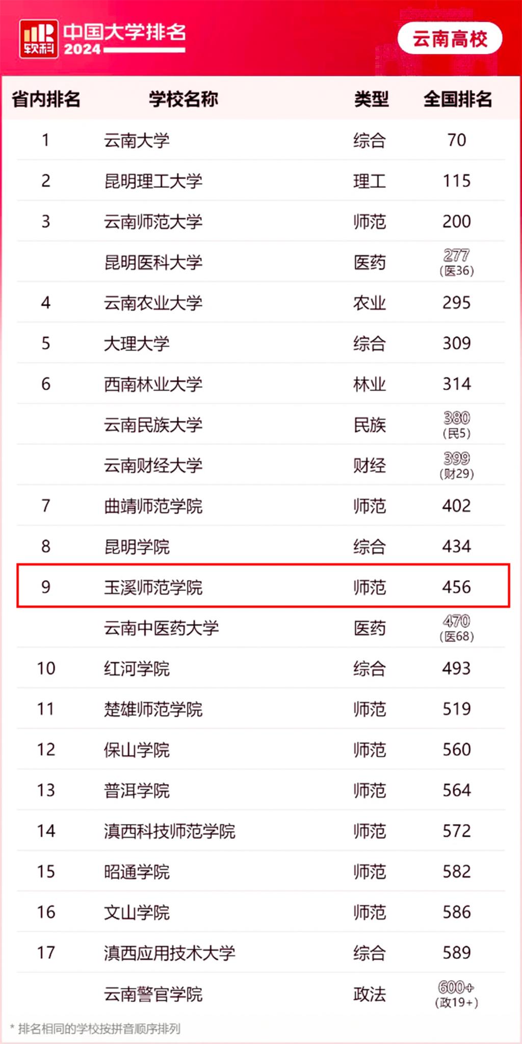 云南高校在本次排名中表现亮眼,共有17所高校进入主榜,其中10所高校位列主榜500强。在此次排名中,“双一流”高校云南大学排名再攀升,位列全国第70名,较2023年进步10个位次,持续领跑全省高校。此外,位列前500名的高校还有昆明理工大学(第115名)、云南师范大学(第200名)、云南农业大学(第295名)、大理大学(第309名)、西南林业大学(第314名)、曲靖师范学院(第402名)、昆明学院(第434名)、玉溪师范学院(第456名)和红河学院(第493名)。