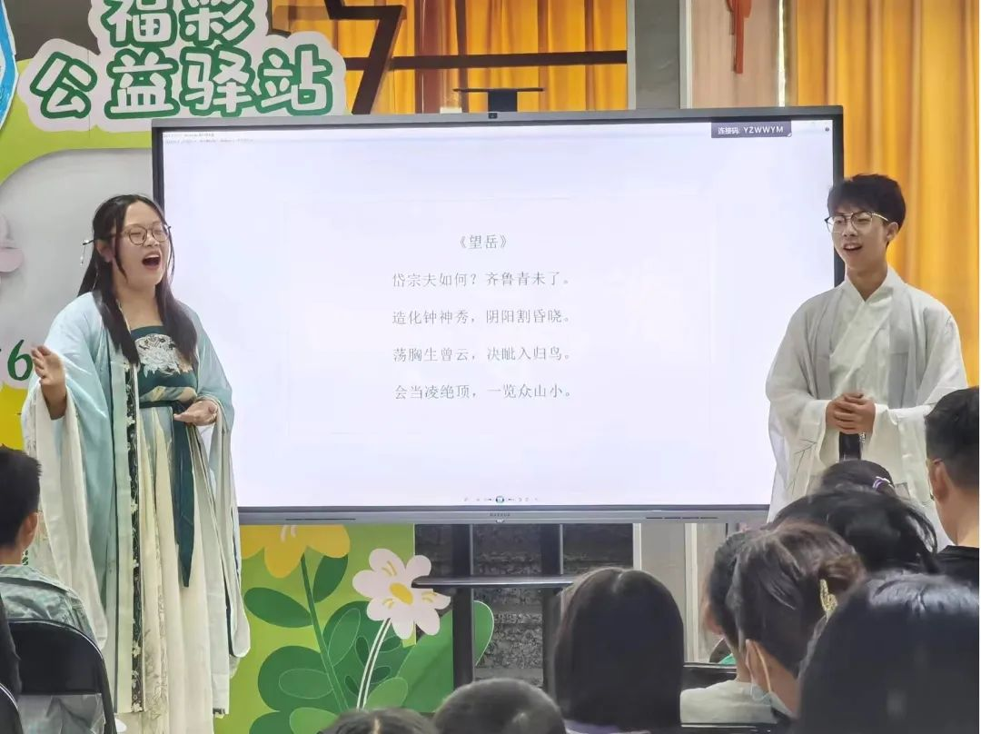 为深入学习贯彻习近平文化思想,传承弘扬中华优秀传统文化,推广普及国家通用语言文字,日前,国家语言文字推广基地(玉溪师范学院)师生推普团和“中华优秀传统文化”实践团走进云南省玉溪市彩虹社区,开展主题为“诵读经典诗词 书香浸润社区”的文化实践活动。玉溪师范学院师生以校本教材《诵读选本》中的古典诗词为内容,通过讲解诵读技巧和吟唱方法、简析诗歌内涵等方式,以书传情、以书言志,带领当地社区孩子和家长穿越时空,感受诗词里的喜怒哀乐,领略祖国壮美山河。活动还开展了集体诵读、分组展示、有奖问答等活动,营造了浓郁的书香氛围。