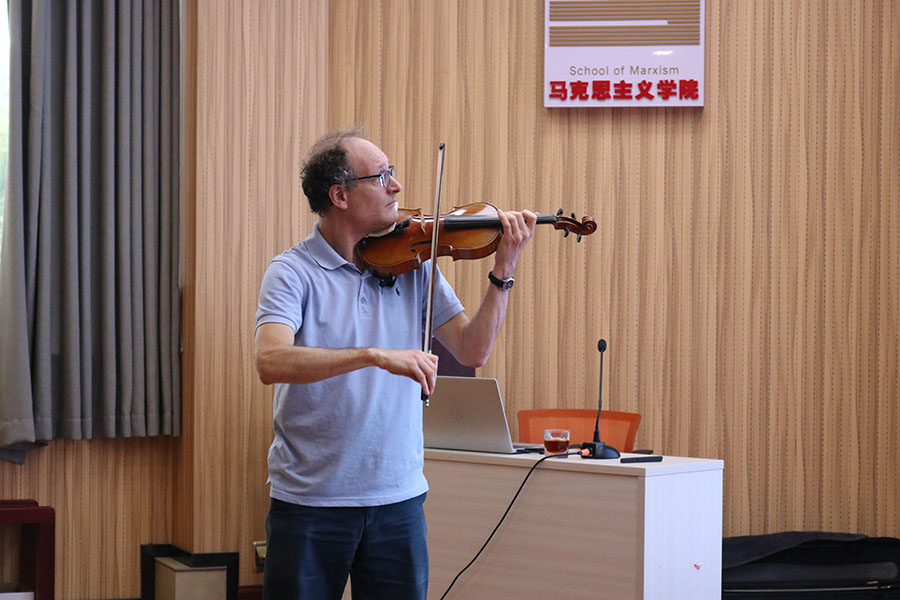 讲堂以“民族象征的塑造:纪念聂耳[1935—1949]”为主题,从历史角度,详细解读了聂耳创作的音乐作品在1935年至1949年期间,对当时社会的影响,并通过丰富的历史资料和翔实的分析,展示了聂耳音乐作品的艺术魅力和社会意义。其间,何稼书与玉溪师范学院学生进行互动,并现场用小提琴演绎聂耳音乐作品《梅娘曲》。