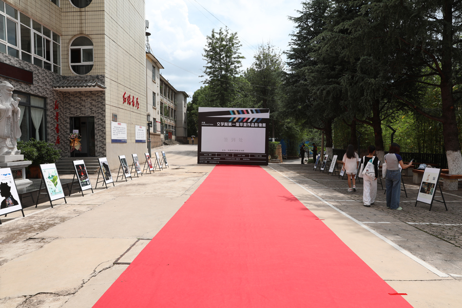 毕业作品影像展的红毯铺设,寓意着学子们即将踏上人生崭新的征程