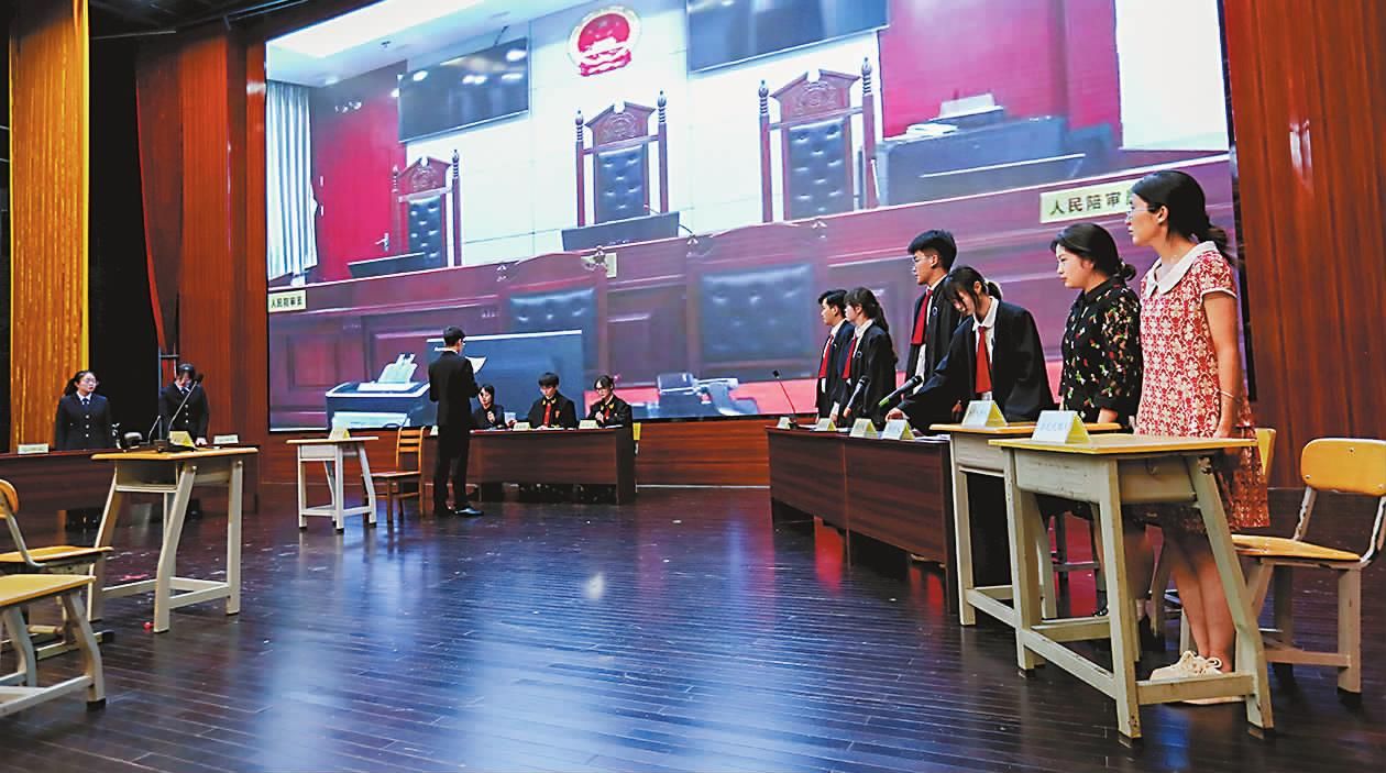 活动模拟法院开庭审理一起未成年人故意伤害案件,学生扮演不同角色,庭审现场庄严肃穆、严谨有序。公诉人详细阐述被告的违法行为及其社会危害性,辩护人为被告进行辩护,审判长和审判员公正审理案件,最终作出判决。