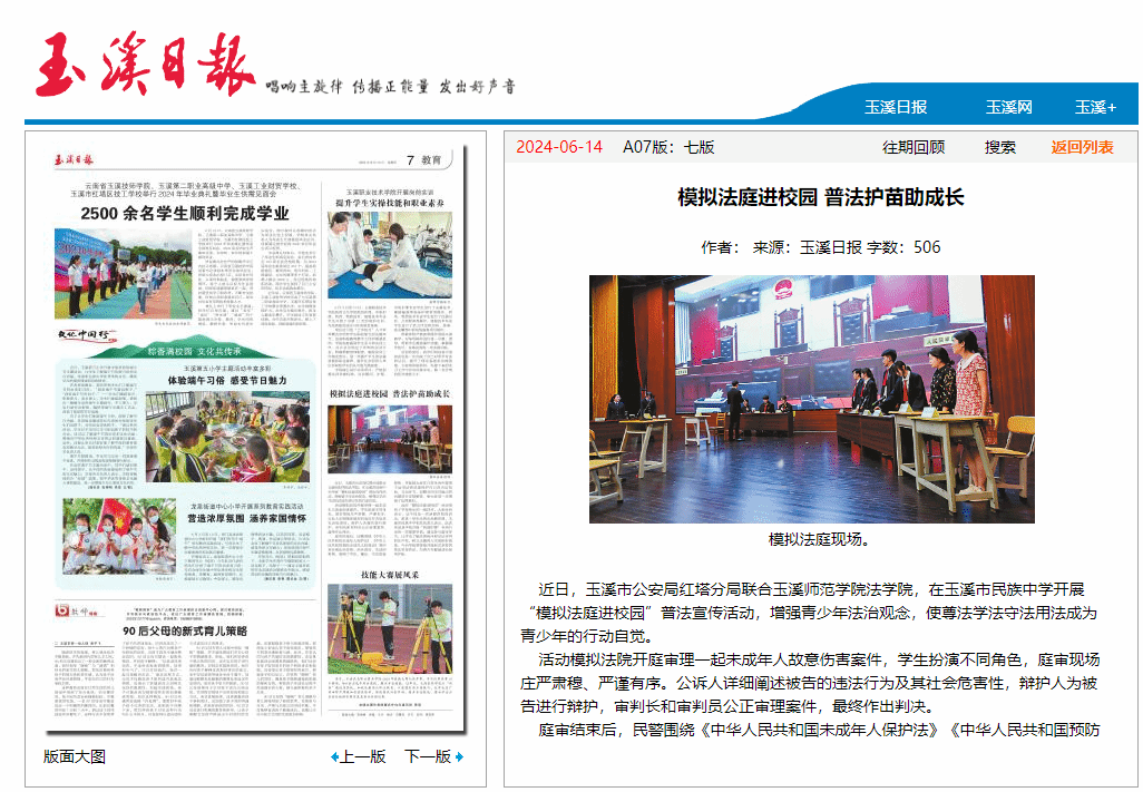 近日,玉溪市公安局红塔分局联合玉溪师范学院法学院,在玉溪市民族中学开展“模拟法庭进校园”普法宣传活动,增强青少年法治观念,使尊法学法守法用法成为青少年的行动自觉。