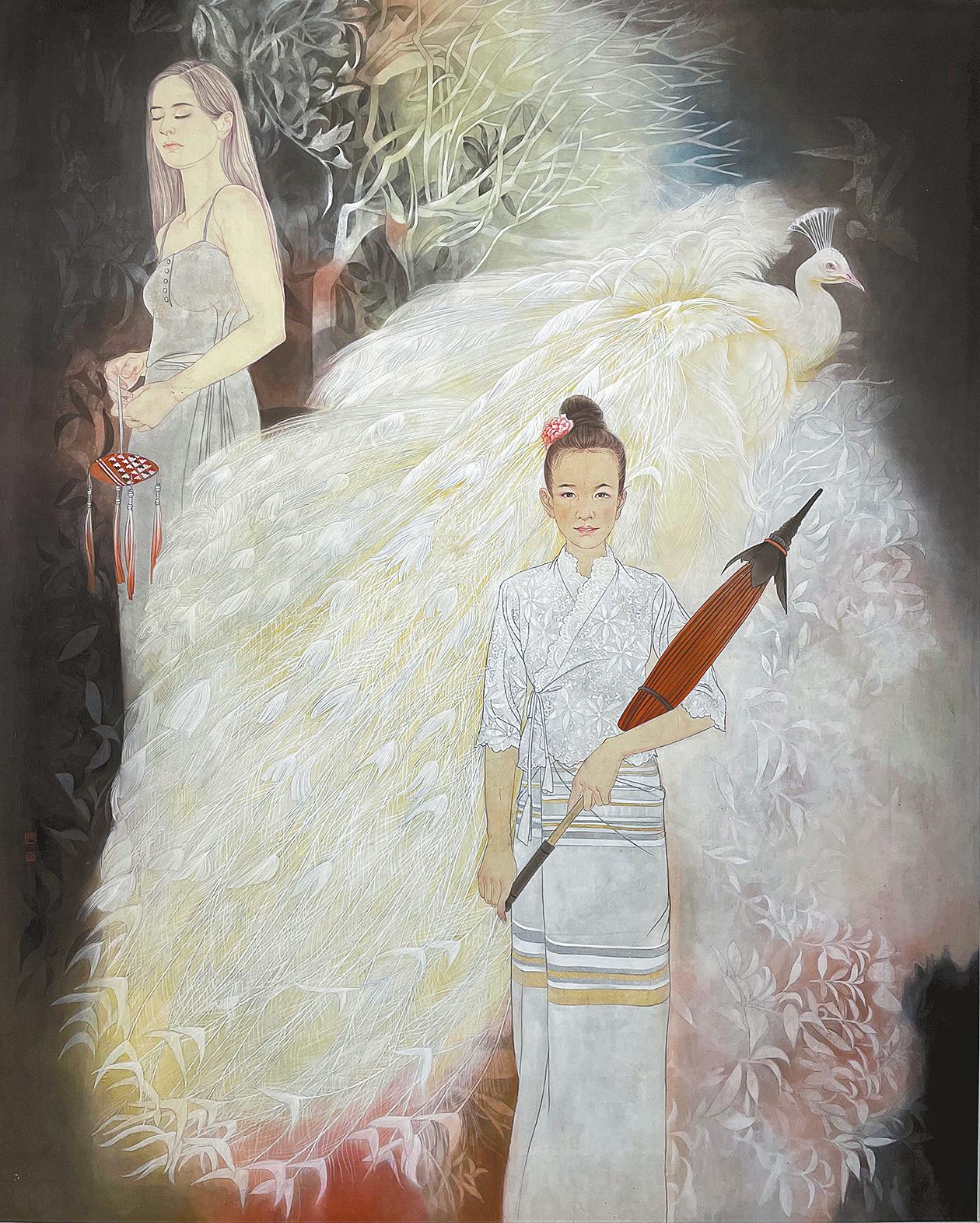 赵芳说:“作品《风起云之南》的构思早在2020年就已经成熟。其间,因课题研究的关系,我们对东南亚国家的壁画和云南傣族地区的壁画做了大量艺术考察。傣族大多择水而居,有丰富的文化与生态资源,这些独特的元素深深触动了我,让我对云南这片土地有了更深的情感联结。在一开始的构思中,我设想的背景并不是树枝,而是在呈现傣族少女和孔雀形象的同时,以展现傣族历史文化信息的壁画为背景。然而,随着创作思考的进一步深入,我逐渐意识到,直接将壁画元素融入画中,虽能展现地域文化的独特韵味,却可能会限制画面的想象空间。于是,我决定让背景更加灵动,以风为主角,它不仅是无形的画笔,更是连接人与自然的桥梁。树枝随风摇曳,不仅增添了画面的动态美,也寓意着生命在无常中的坚韧。创作前期,有同仁曾提议将象征云南的孔雀换为大象,但从画面表达的角度,我还是觉得孔雀更为合适。整幅作品以黑、白两色为主体,这是遵循中国传统绘画中讲究的黑白之美,在黑色背景中凸显白,以背景凸显孔雀,孔雀再衬托人物,形成层次分明的视觉感受。这也是我对彩云之南独特人文形态的一种表达呈现。”