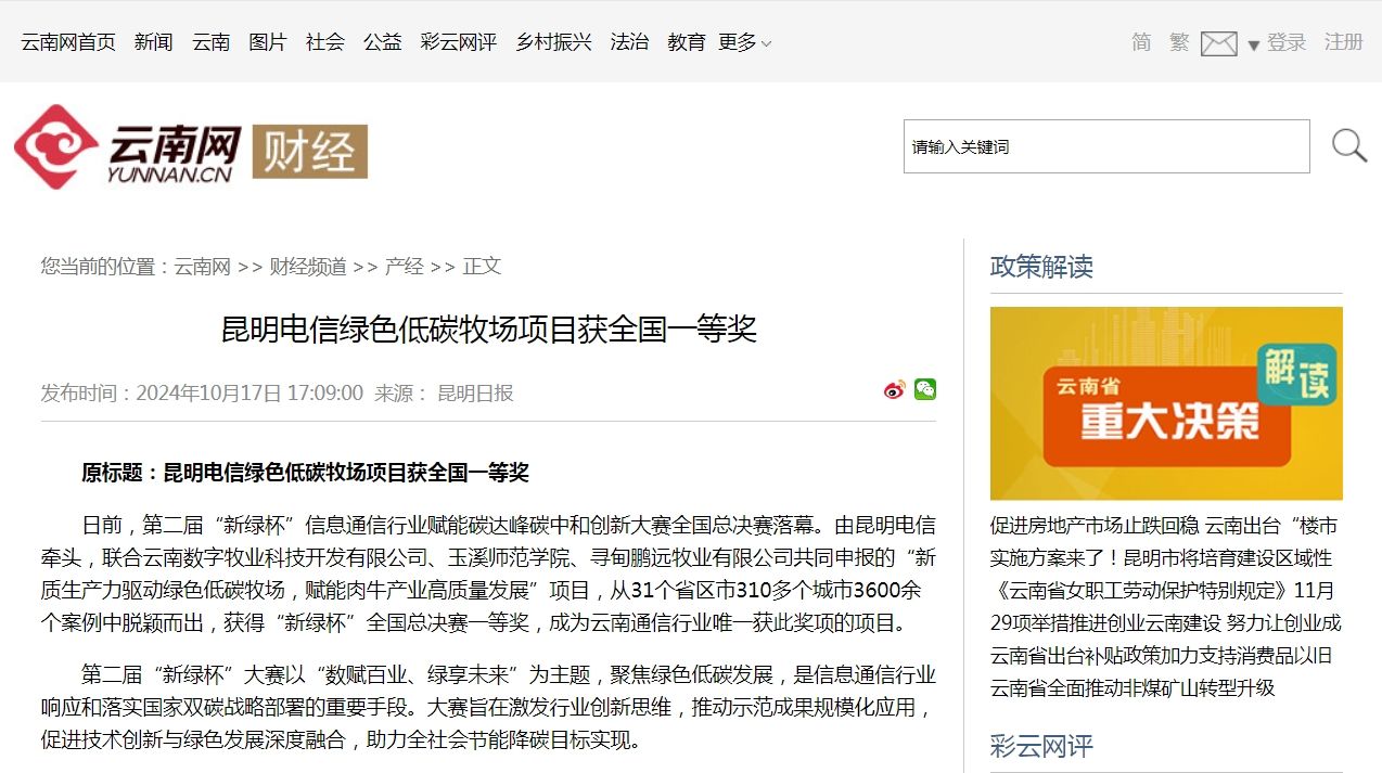 日前,第二届“新绿杯”信息通信行业赋能碳达峰碳中和创新大赛全国总决赛落幕。由昆明电信牵头,联合云南数字牧业科技开发有限公司、玉溪师范学院、寻甸鹏远牧业有限公司共同申报的“新质生产力驱动绿色低碳牧场,赋能肉牛产业高质量发展”项目,从31个省区市310多个城市3600余个案例中脱颖而出,获得“新绿杯”全国总决赛一等奖,成为云南通信行业唯一获此奖项的项目。