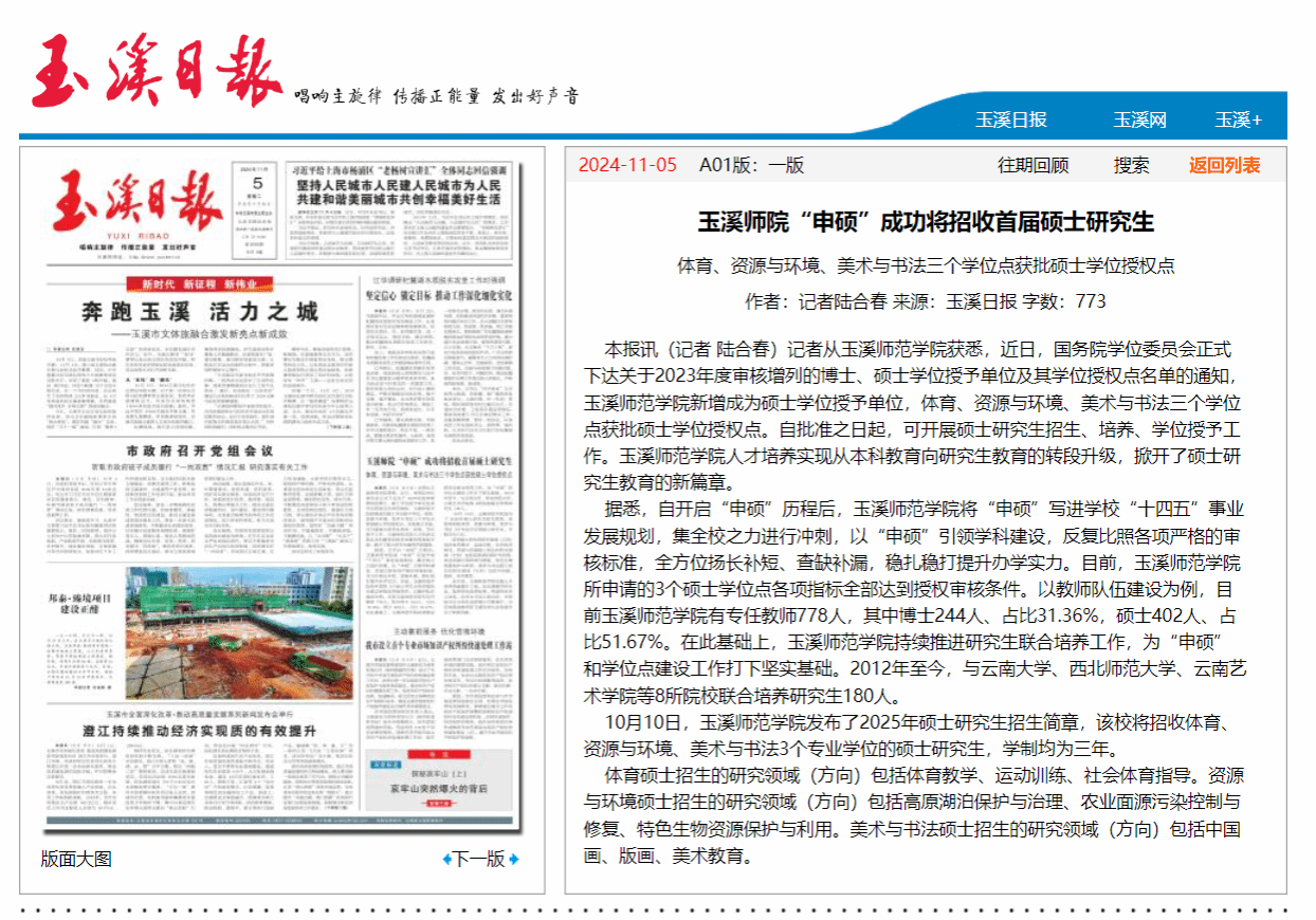 本报讯(记者 陆合春)记者从玉溪师范学院获悉,近日,国务院学位委员会正式下达关于2023年度审核增列的博士、硕士学位授予单位及其学位授权点名单的通知,玉溪师范学院新增成为硕士学位授予单位,体育、资源与环境、美术与书法三个学位点获批硕士学位授权点。自批准之日起,可开展硕士研究生招生、培养、学位授予工作。玉溪师范学院人才培养实现从本科教育向研究生教育的转段升级,掀开了硕士研究生教育的新篇章。