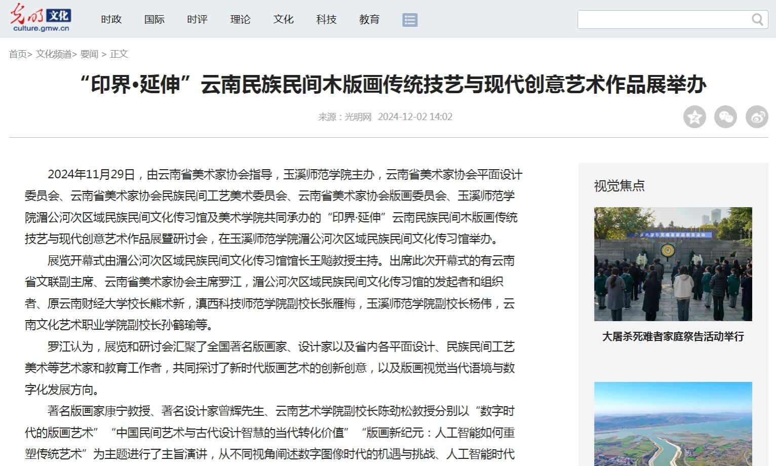 2024年11月29日,由云南省美术家协会指导,玉溪师范学院主办,云南省美术家协会平面设计委员会、云南省美术家协会民族民间工艺美术委员会、云南省美术家协会版画委员会、玉溪师范学院湄公河次区域民族民间文化传习馆及美术学院共同承办的“印界·延伸”云南民族民间木版画传统技艺与现代创意艺术作品展暨研讨会,在玉溪师范学院湄公河次区域民族民间文化传习馆举办。