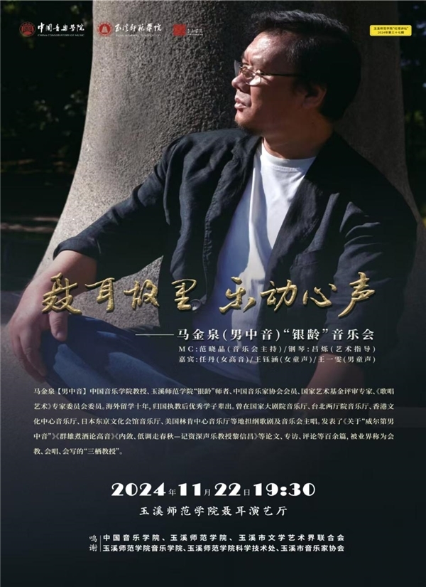 2024年9月,马金泉教授通过云南省“银龄计划”以专家身份入驻玉溪师范学院,是他到玉溪后继本学期两次大型公开讲座后,又精心筹备的一场音乐会。作为高校声乐教师,能够在繁重的教学和科研工作之余,在每年的同一天或是举办独唱音乐会、师生演唱会,或是到高校举办学术讲座,他已经坚持了二十余年,这对任何一位高校声乐教师来说都是难以完成的挑战,但马教授却坚持不懈,乐在其中。本场音乐会秉承了马金泉教授一贯的音乐态度——严谨、专业、艺术,这不仅是他对人生的感悟,也是他对世界的理解。