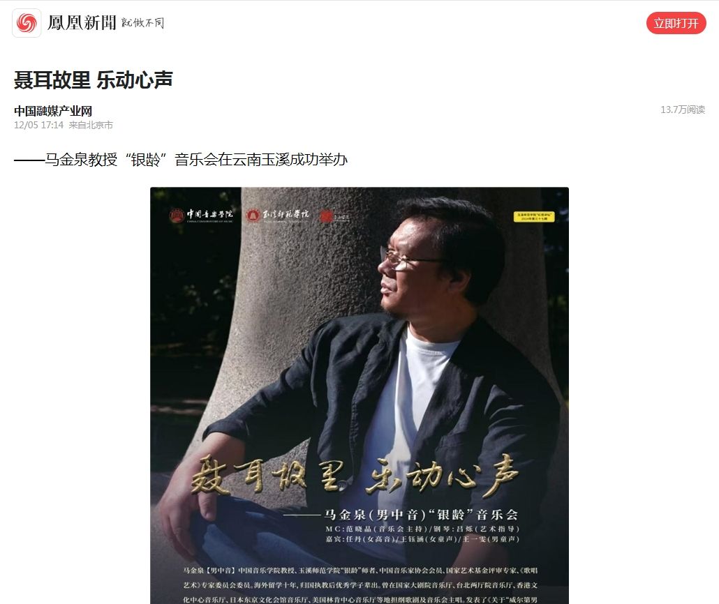 玉溪,作为人民音乐家聂耳的故里,今年又恰逢聂耳诞辰112周年,在这片土地上举办音乐会选用聂耳作品,具有特殊而厚重的意义。一首《卖报歌》恍惚间将人们的思绪一下子拉回到了九十多年前战火纷飞、满目疮痍的旧中国,这首根据聂耳亲身生活经历创作的声乐作品,早在上世纪30年代便唱遍大江南北,而当它在和平年代的今天再次响起,不禁令人今昔对比,倍加珍惜现在的美好生活。在马教授沉稳深情的演唱,在男童声小歌手王一雯身着世纪报童服装载歌载舞的生动配合下,一曲唱罢,全场观众的热忱被瞬间点燃。马教授用他那浑厚的男中音演唱的极具云南地方色彩的《阿佤人民唱新歌》唱罢,群情激昂。最后,马金泉教授邀请全体到场者起立,一同高唱聂耳最负盛名的《义勇军进行曲》,音乐会达到了最高潮,相信每个人都会永远记住这个特别而值得纪念的国歌演唱经历。当主持人玉溪师范学院音乐学院党委副书记、副院长范晓晶将今夜是马金泉教授生日的秘密公布于众,全场自发唱起生日歌,音乐会在一种温馨、感动、欢乐气氛中落下帷幕。