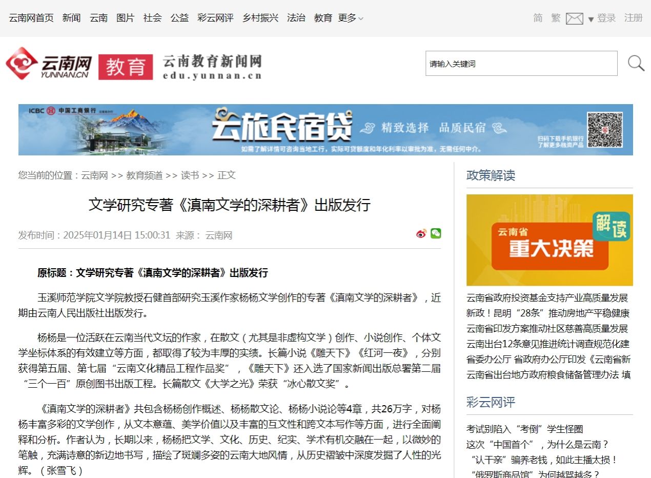 玉溪师范学院文学院教授石健首部研究玉溪作家杨杨文学创作的专著《滇南文学的深耕者》,近期由云南人民出版社出版发行。