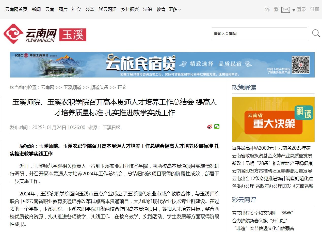 2024年,玉溪农职学院面向玉溪市重点产业成立了玉溪现代农业市域产教联合体,与玉溪师院联合申报云南省职业教育贯通培养改革试点高本贯通项目,大力助推现代农业技术专业群建设。在过去的一个学期,玉溪师院、玉溪农职学院围绕两校合作的高本贯通项目,紧扣人才培养目标,整合两校优质教育资源,扎实推进各项教学、实践工作,在教育教学、实践活动、学生发展等方面取得阶段性成果。