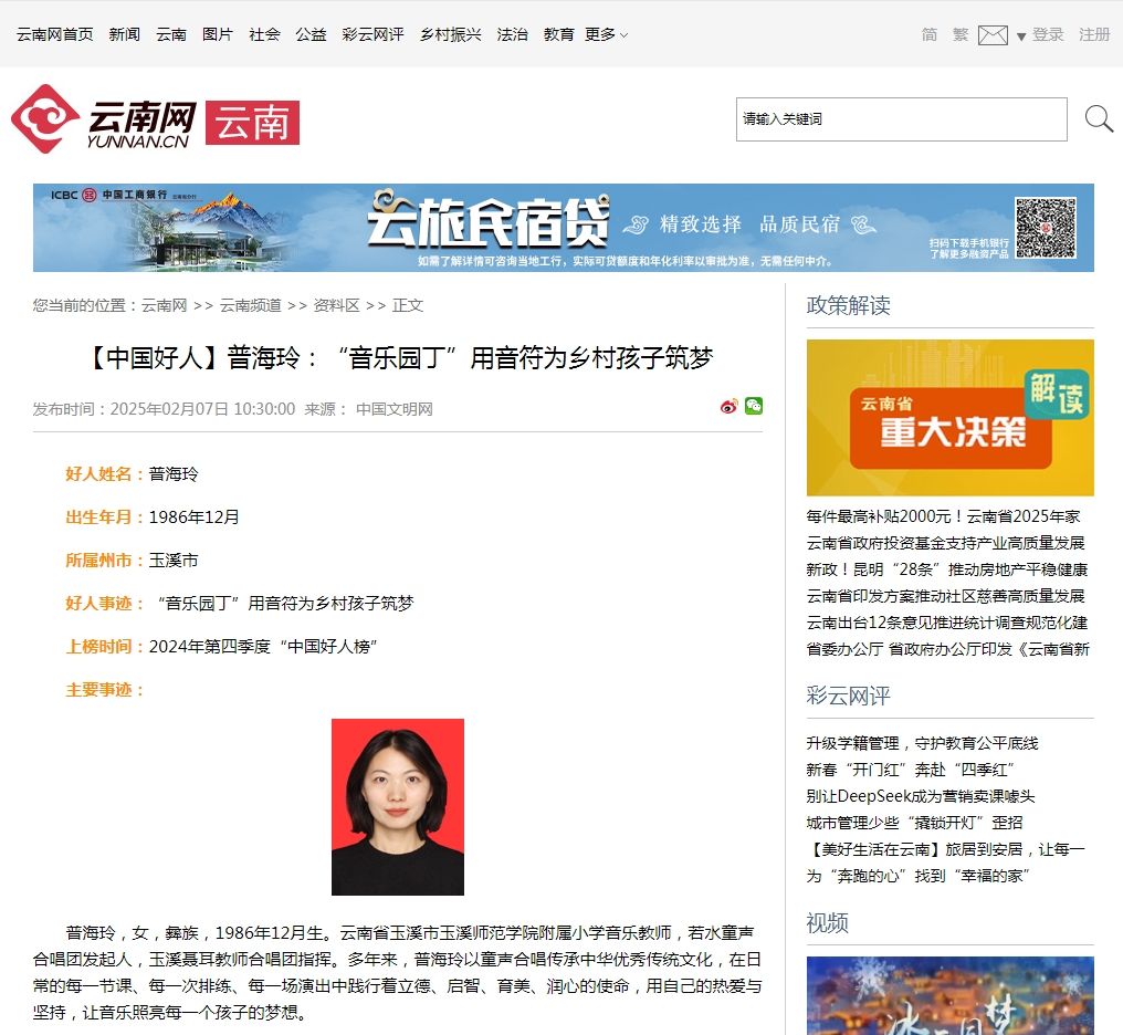 从“呦呦鹿鸣”到“清明时节雨纷纷”,从《螃蟹歌》到《西游行》,她通过合唱的形式,巧妙地将传统文化、地方文化融入歌曲中,在守正创新中唱响经典。玉溪聂耳师生合唱团以《小雅·鹿鸣》《螃蟹歌》《清明》等一系列作品频频出圈,普海玲带领师生合唱团走上2024年中央广播电视总台元宵晚会舞台,参与了2024网络媒体论坛开幕式、第十二届澜沧江湄公河流域国家文化艺术节等众多国内国际有影响力的演出和活动,用合唱讲好了云南故事和中国故事。