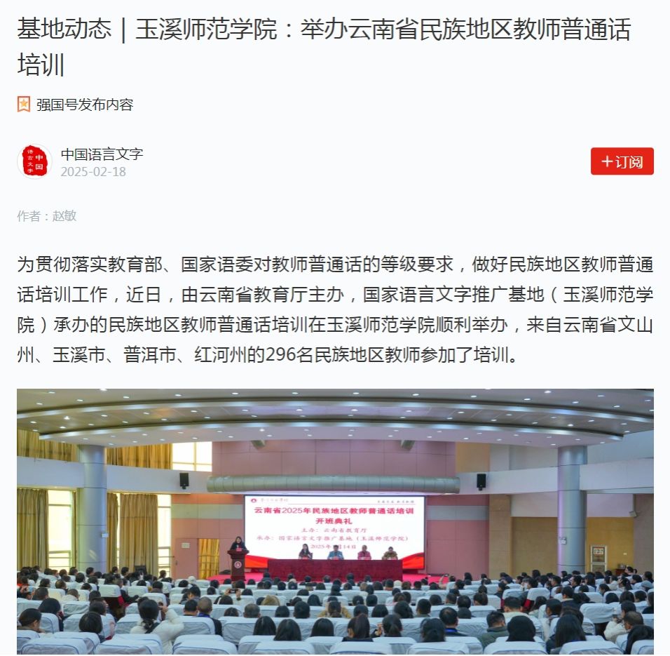 为贯彻落实教育部、国家语委对教师普通话的等级要求,做好民族地区教师普通话培训工作,近日,由云南省教育厅主办,国家语言文字推广基地(玉溪师范学院)承办的民族地区教师普通话培训在玉溪师范学院顺利举办,来自云南省文山州、玉溪市、普洱市、红河州的296名民族地区教师参加了培训。