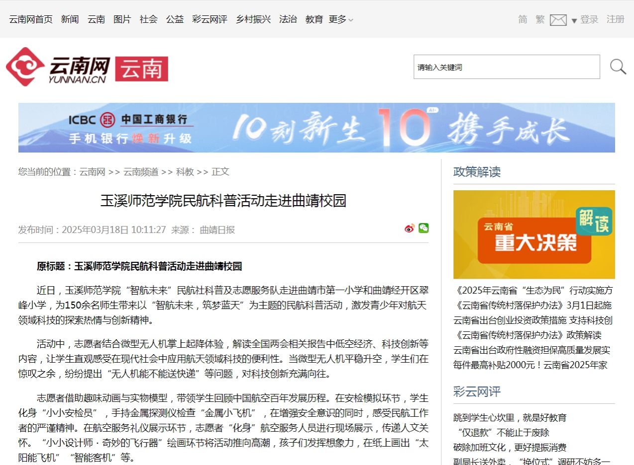 近日,玉溪师范学院“智航未来”民航社科普及志愿服务队走进曲靖市第一小学和曲靖经开区翠峰小学,为150余名师生带来以“智航未来,筑梦蓝天”为主题的民航科普活动,激发青少年对航天领域科技的探索热情与创新精神。