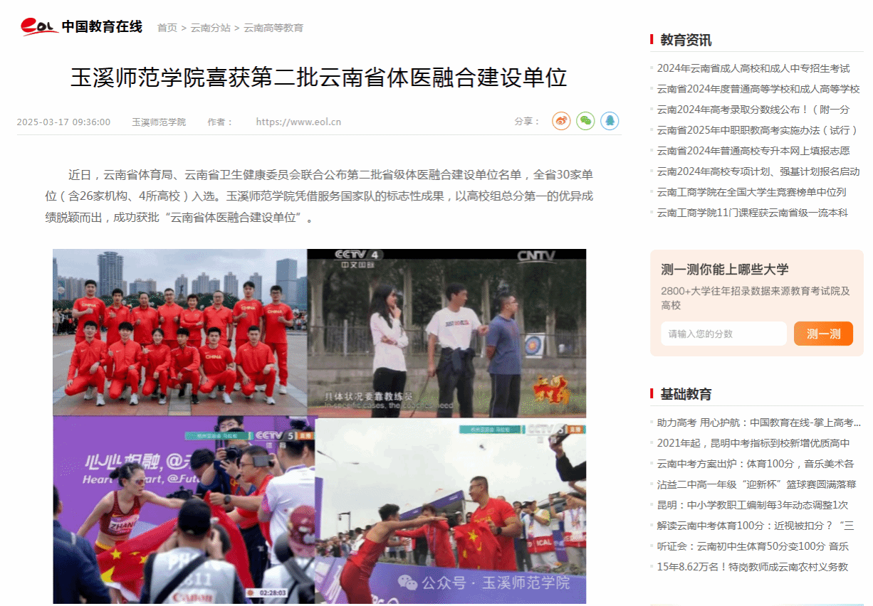近日,云南省体育局、云南省卫生健康委员会联合公布第二批省级体医融合建设单位名单,全省30家单位(含26家机构、4所高校)入选。玉溪师范学院凭借服务国家队的标志性成果,以高校组总分第一的优异成绩脱颖而出,成功获批“云南省体医融合建设单位”。