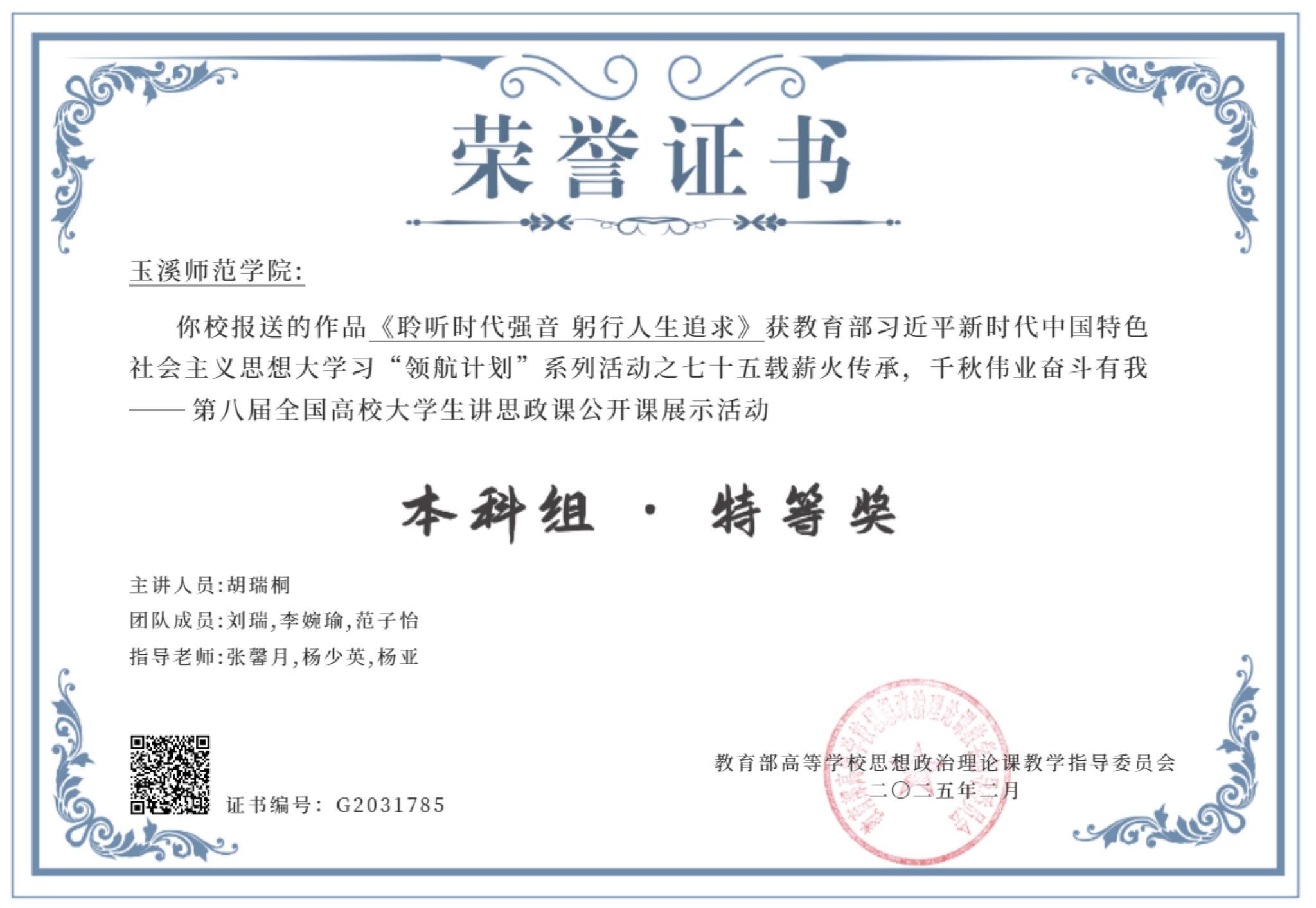 近日,玉溪师范学院一支由胡瑞桐、刘瑞、李婉瑜、范子怡四位女生组成的团队,凭借思政课作品《聆听时代强音 躬行人生追求》斩获第八届全国高校大学生讲思政课本科组特等奖。该奖项全国仅评选16项,云南省高校中唯此1项,展现了玉溪师范学院学子在思政教育领域的卓越实力。