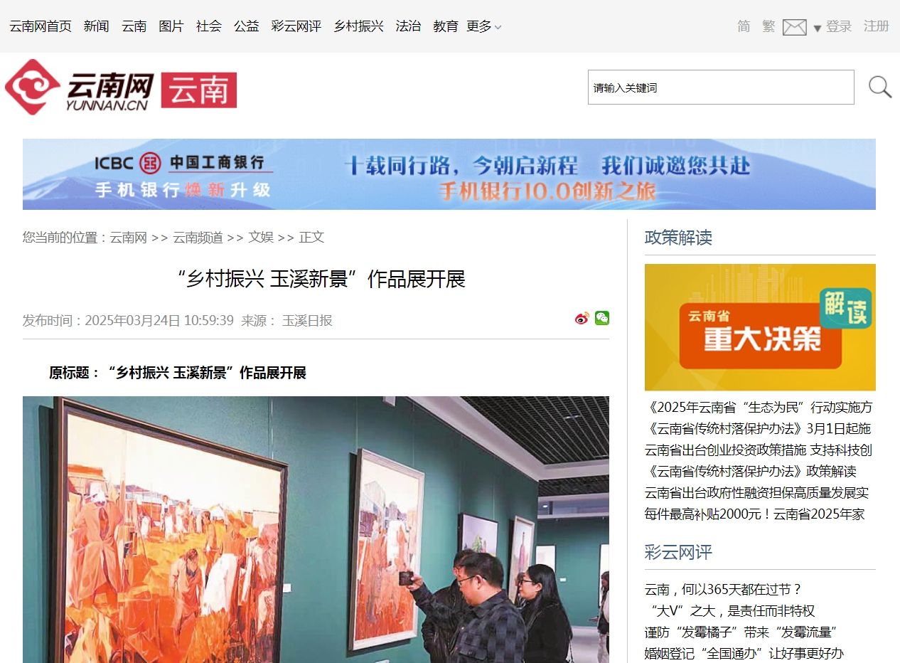 展览现场,观众驻足欣赏,细细品味每一幅作品所蕴含的乡村新貌与人文情怀。这些作品不仅聚焦了玉溪乡村振兴与经济发展的重大成就,还细腻刻画了人民美好生活的点滴细节与真挚情感,更通过多元视角与丰富内涵,描绘了新时代玉溪乡村振兴的生动景象。