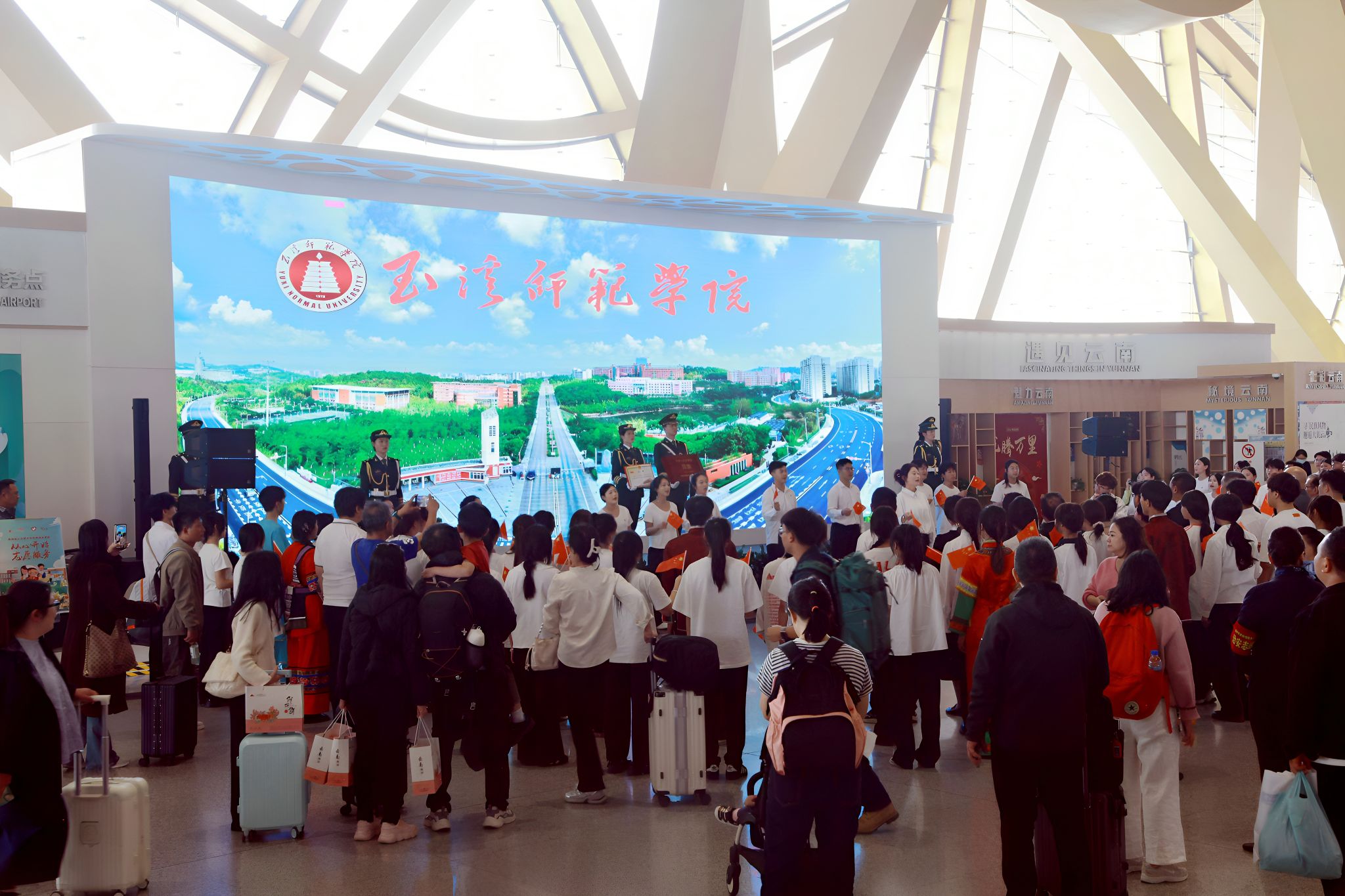 玉溪师范学院师生在昆明长水机场迎接天安门广场国旗。