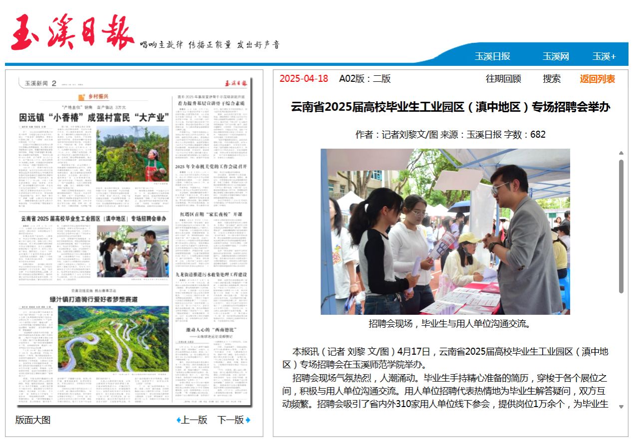 本报讯(记者 刘黎 文/图)4月17日,云南省2025届高校毕业生工业园区(滇中地区)专场招聘会在玉溪师范学院举办。