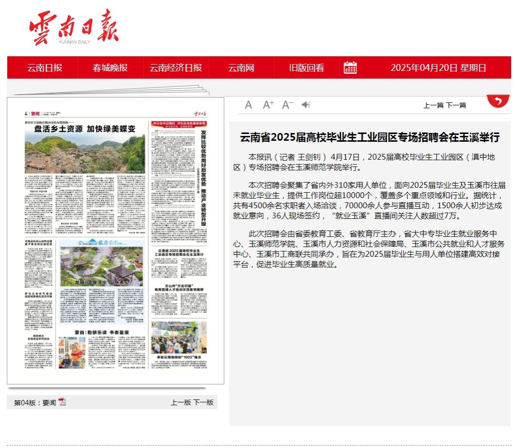 本报讯(记者 王剑钊) 4月17日,2025届高校毕业生工业园区(滇中地区)专场招聘会在玉溪师范学院举行。